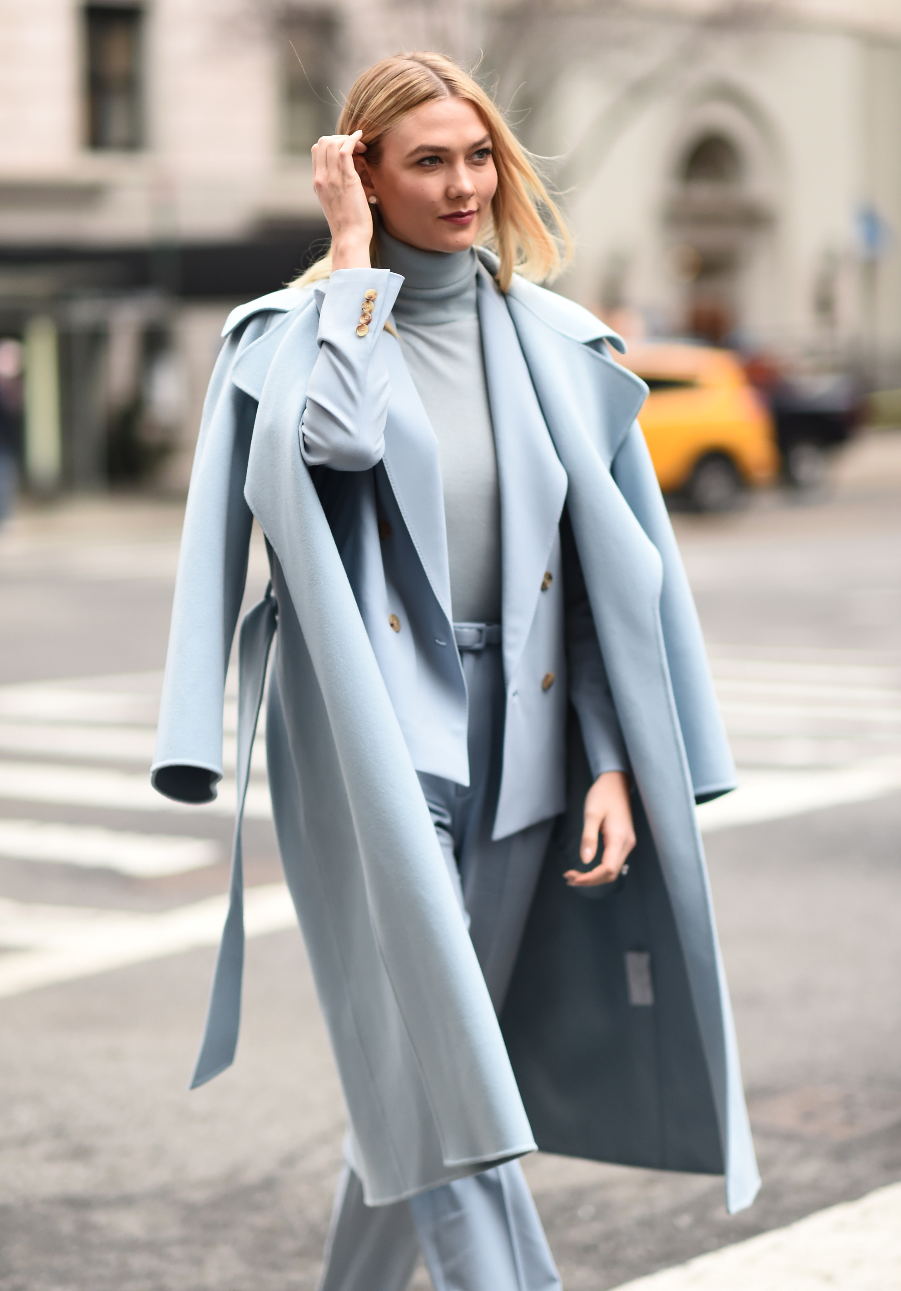 Karlie Kloss is seen wearing a baby blue Ralph Lauren outfit outside the Ralph Lauren show during New York Fashion Week.