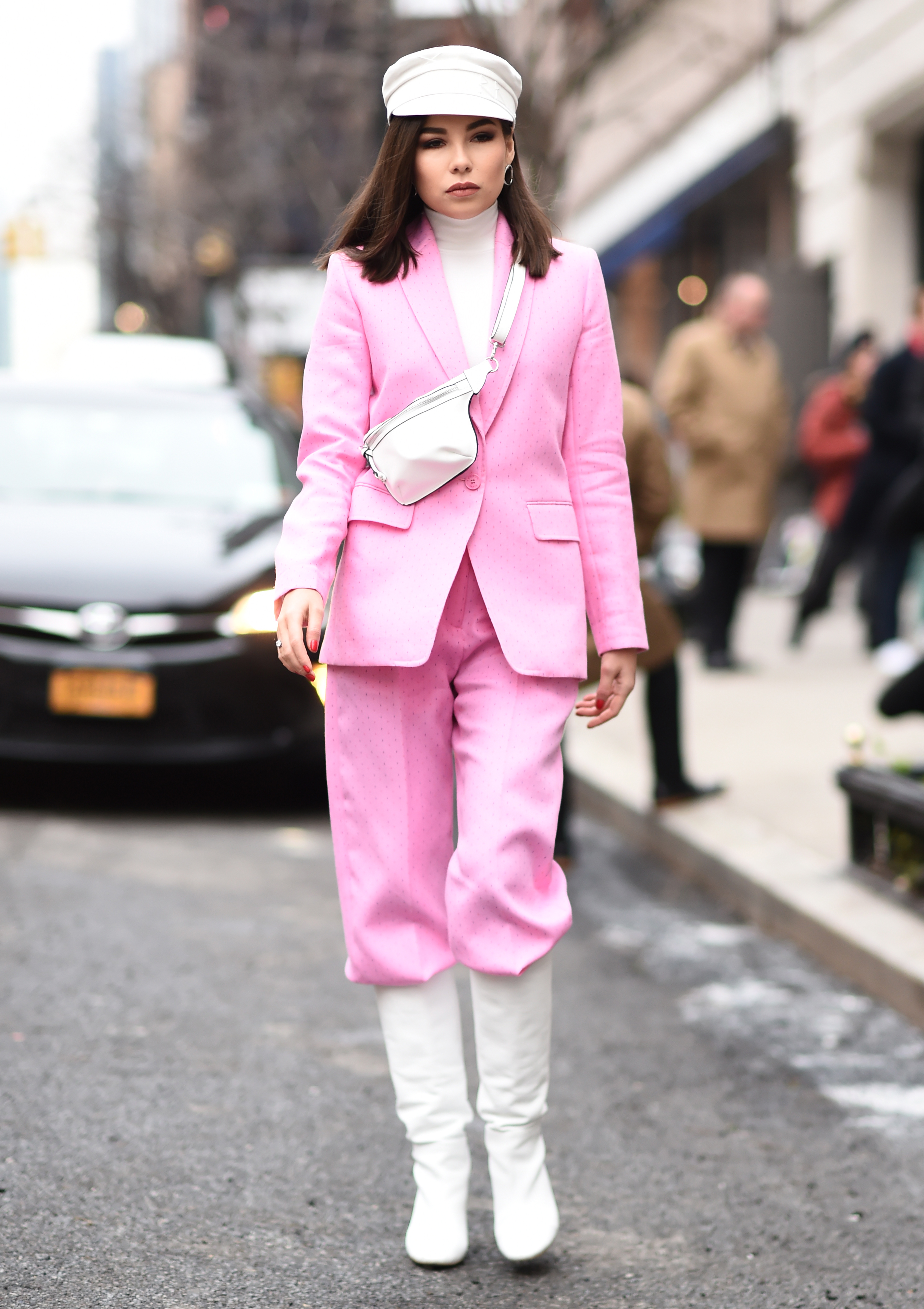 A guest is seen wearing a pink jacket and pants with white leather hat and boots outside the Ralph Lauren show during New York Fashion Week: Women’s Fall/Winter 2019.