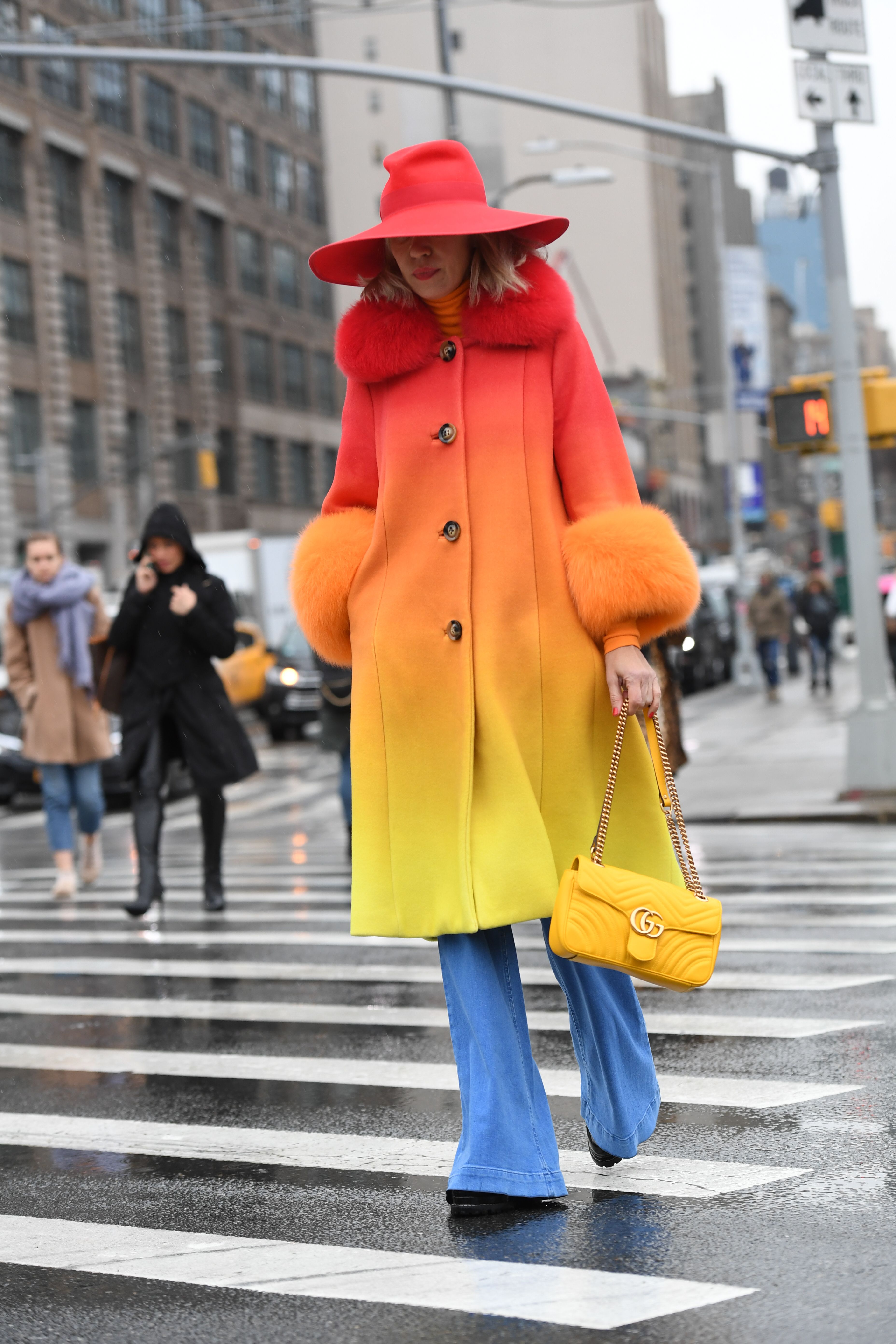 A guest is seen on the streets in New York wearing an ombre coat, hat and flare jeans, carrying a Gucci bag.