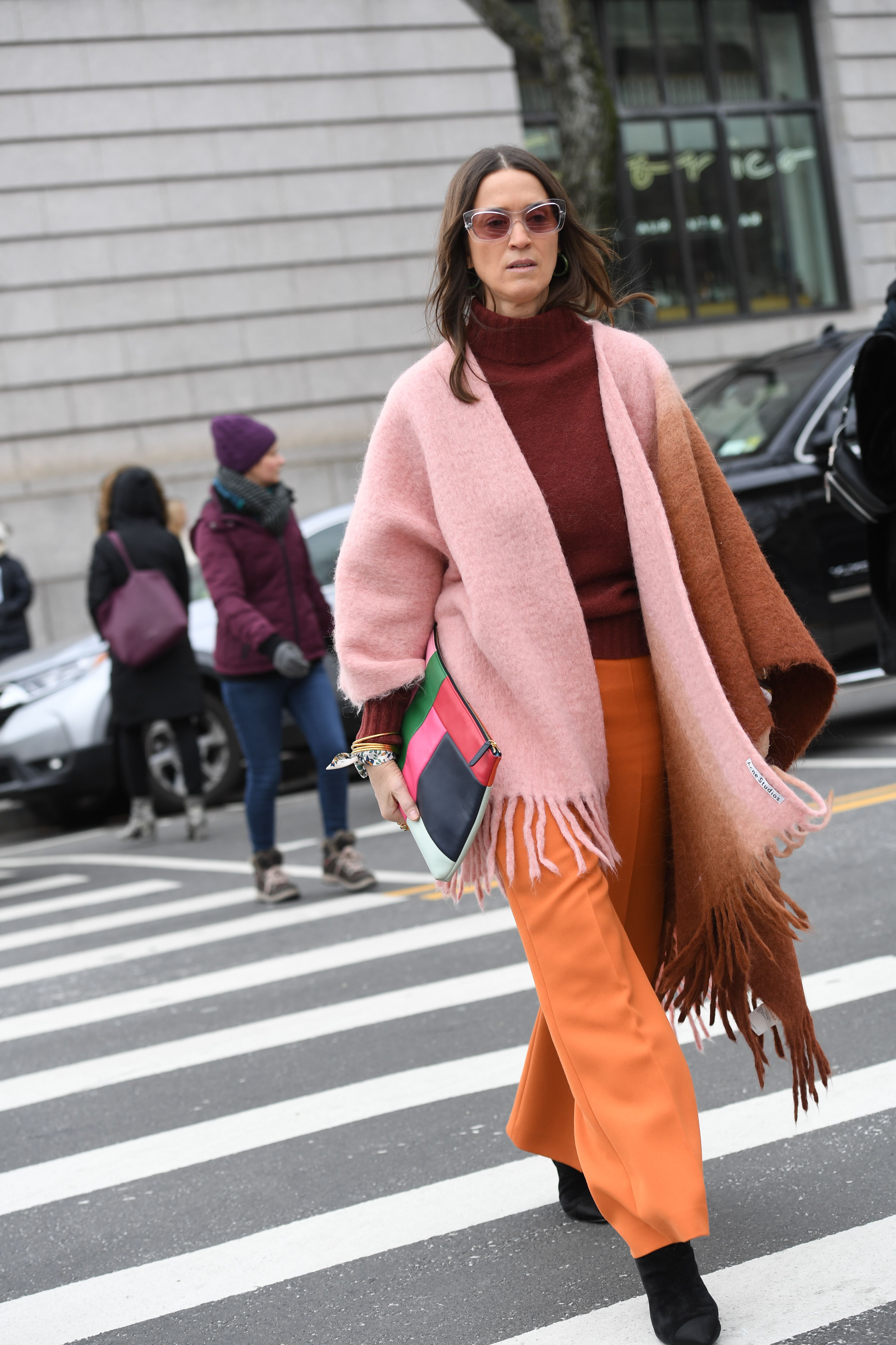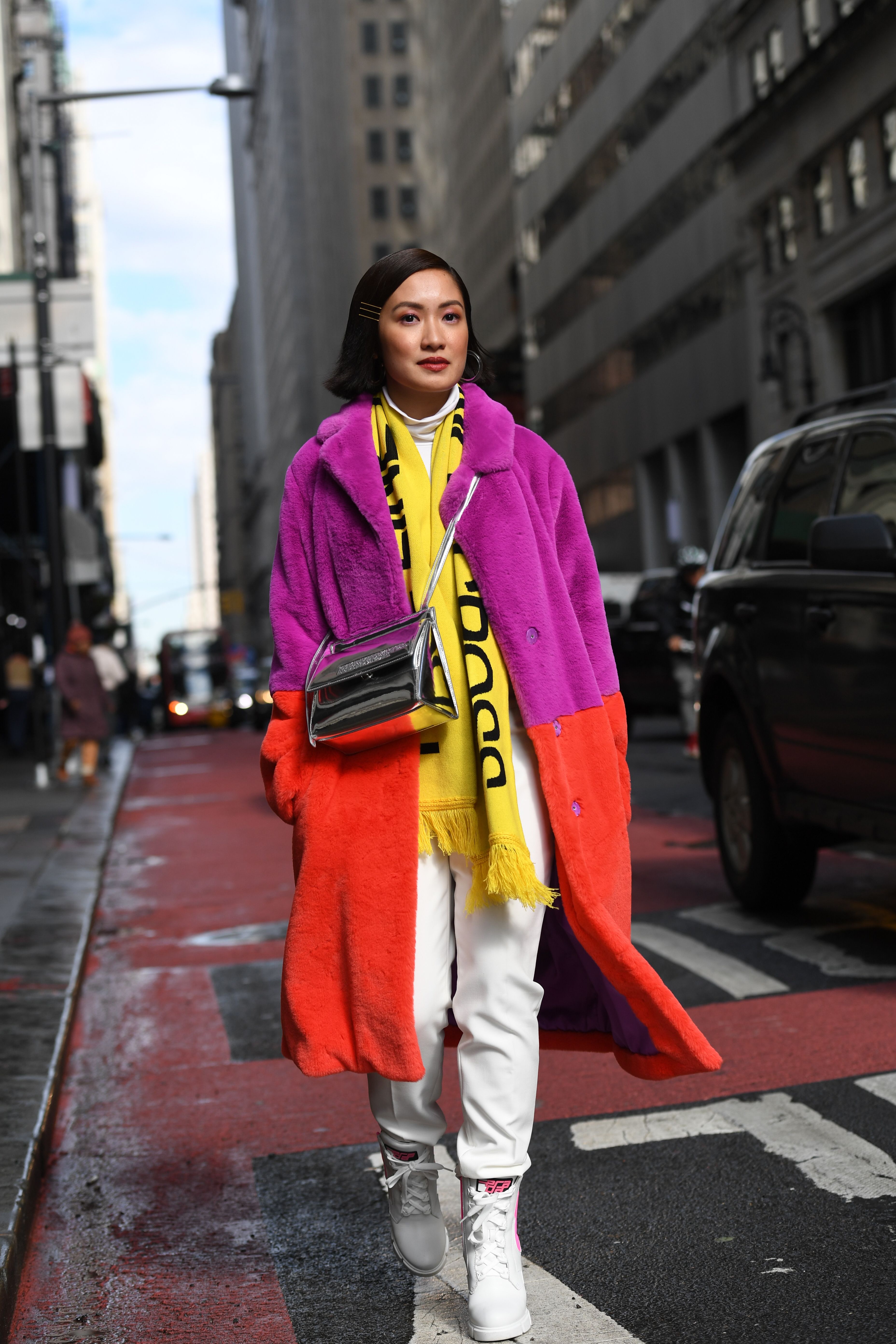 A guest is seen in NYC during NYFW wearing a purple and red coat and yellow scarf.