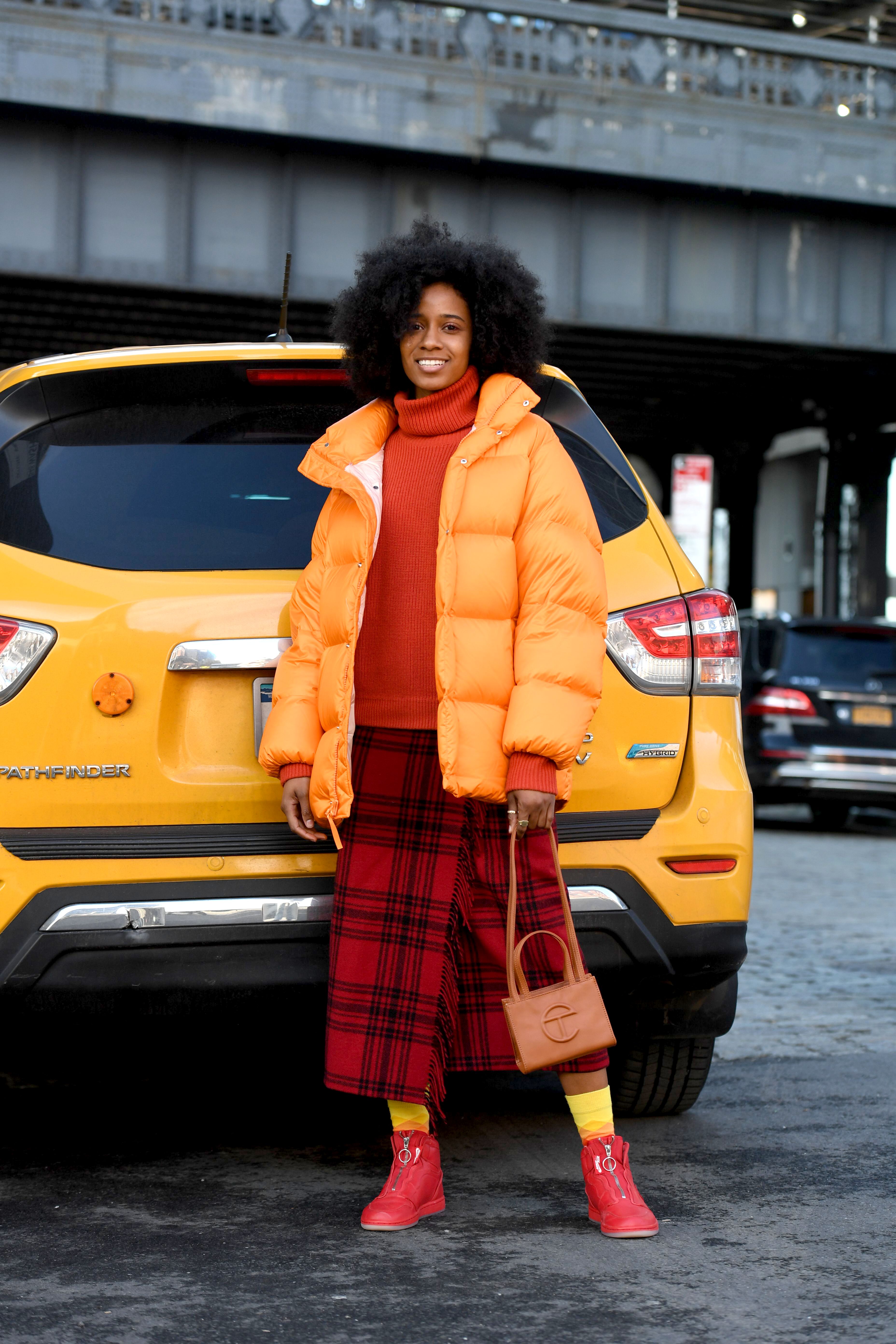 A guest is seen on the streets of New York wearing a red turtleneck, red plaid pants, red sneakers and an orange puffer coat during NYFW.