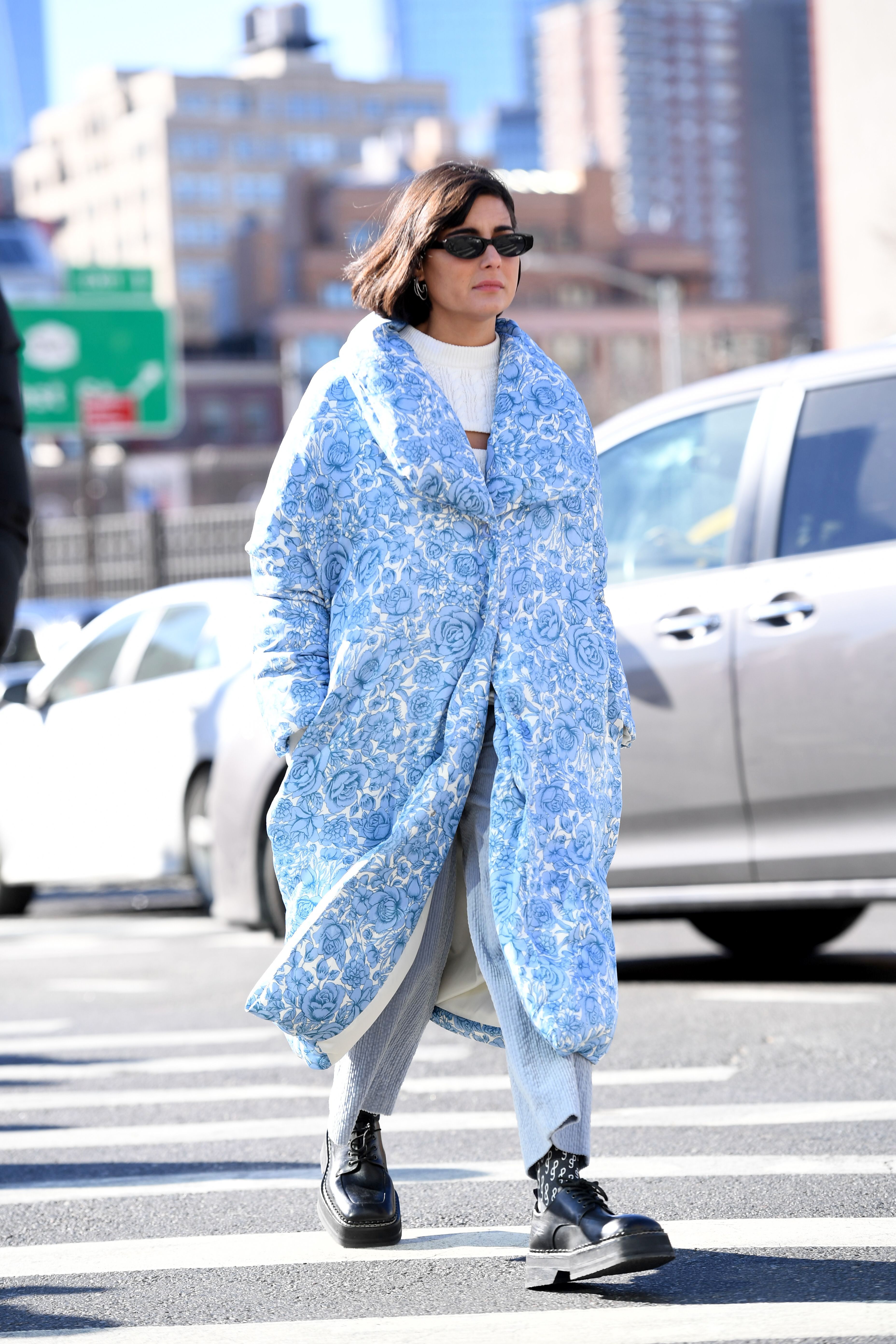 A guest is seen during NYFW 2019 in in a light blue floral coat.