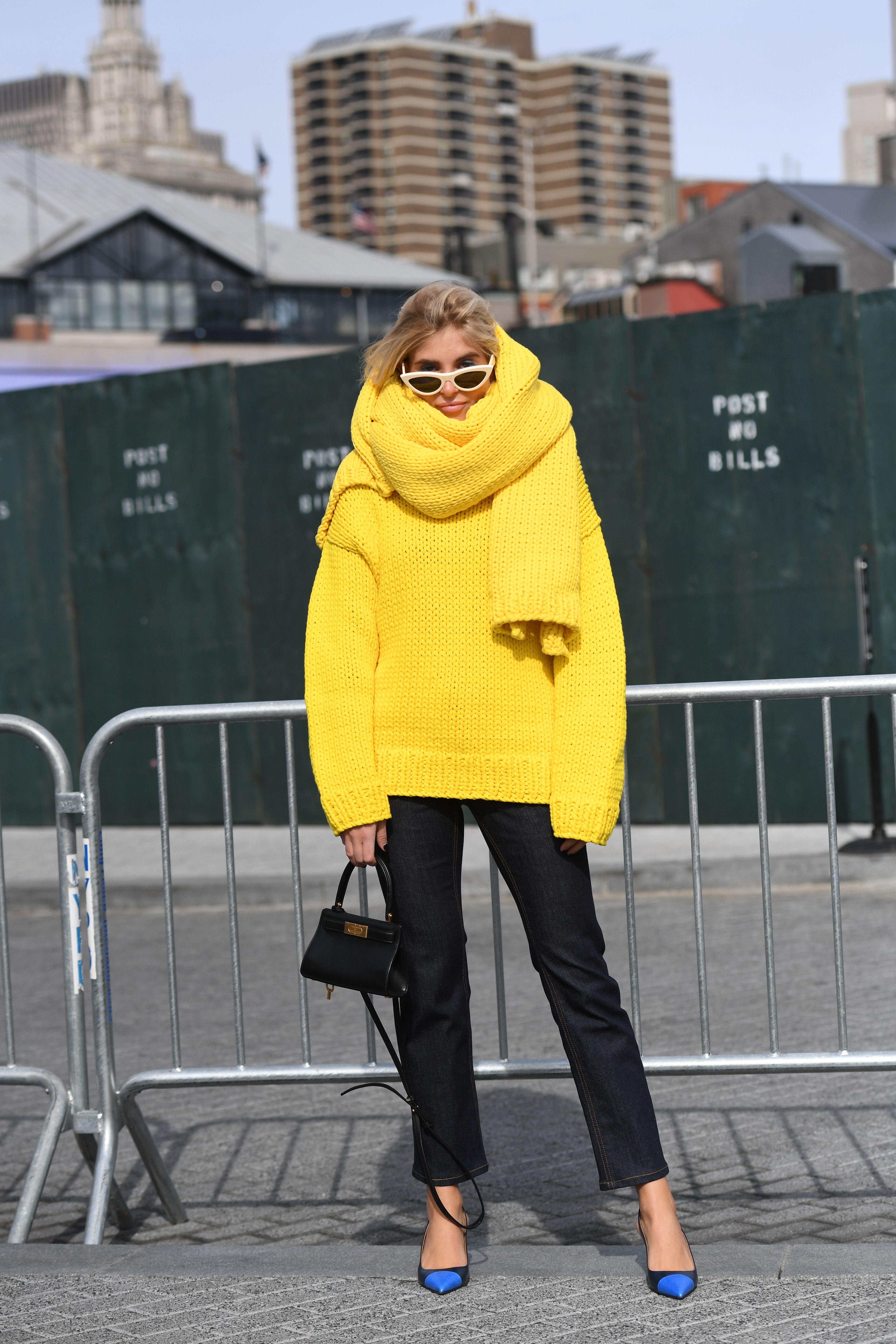 A guest is seen wearing a yellow sweater and scarf during NYFW 2019.