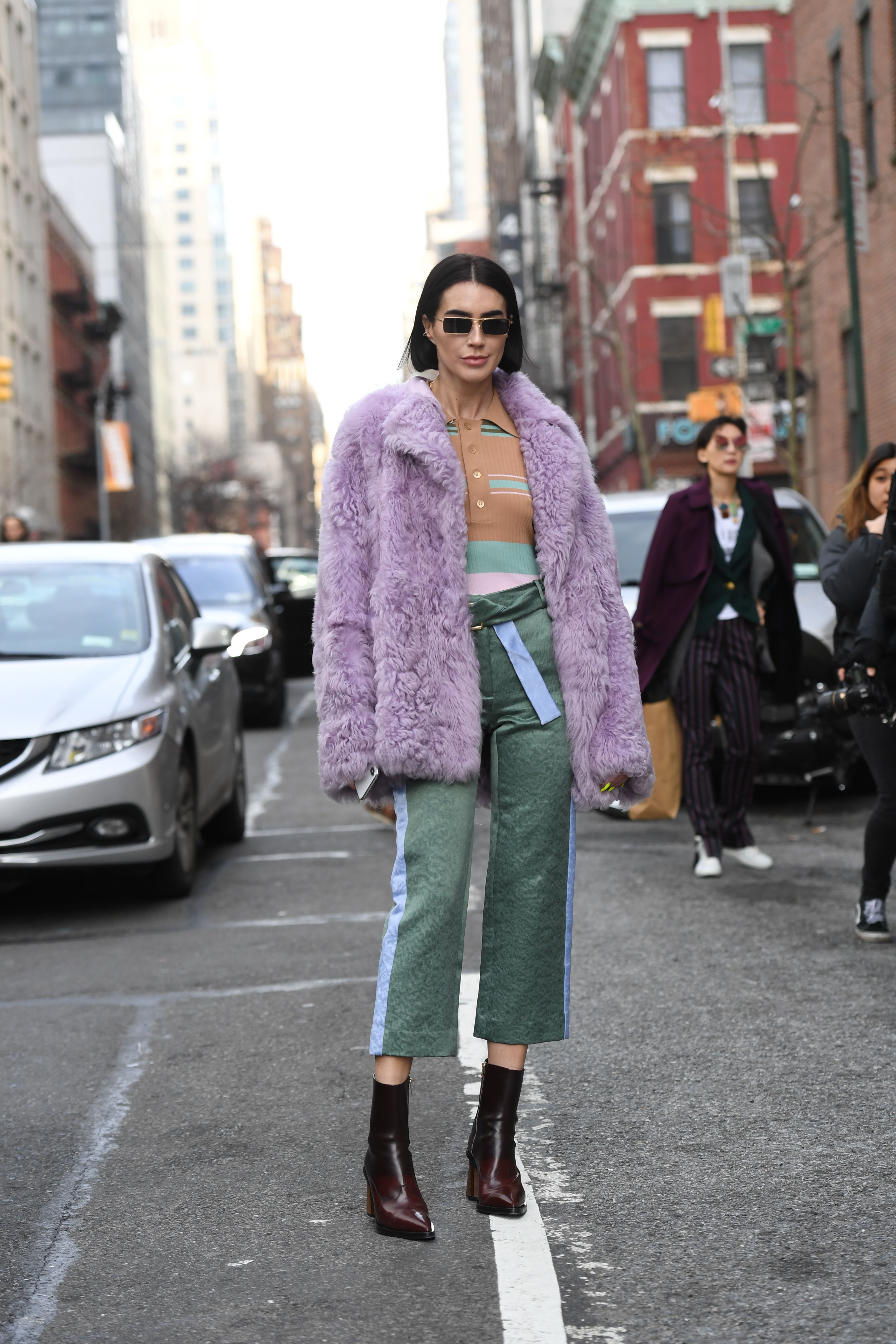 A guest is seen wearing a purple fur coat, green pants and boots during NYFW 2019.