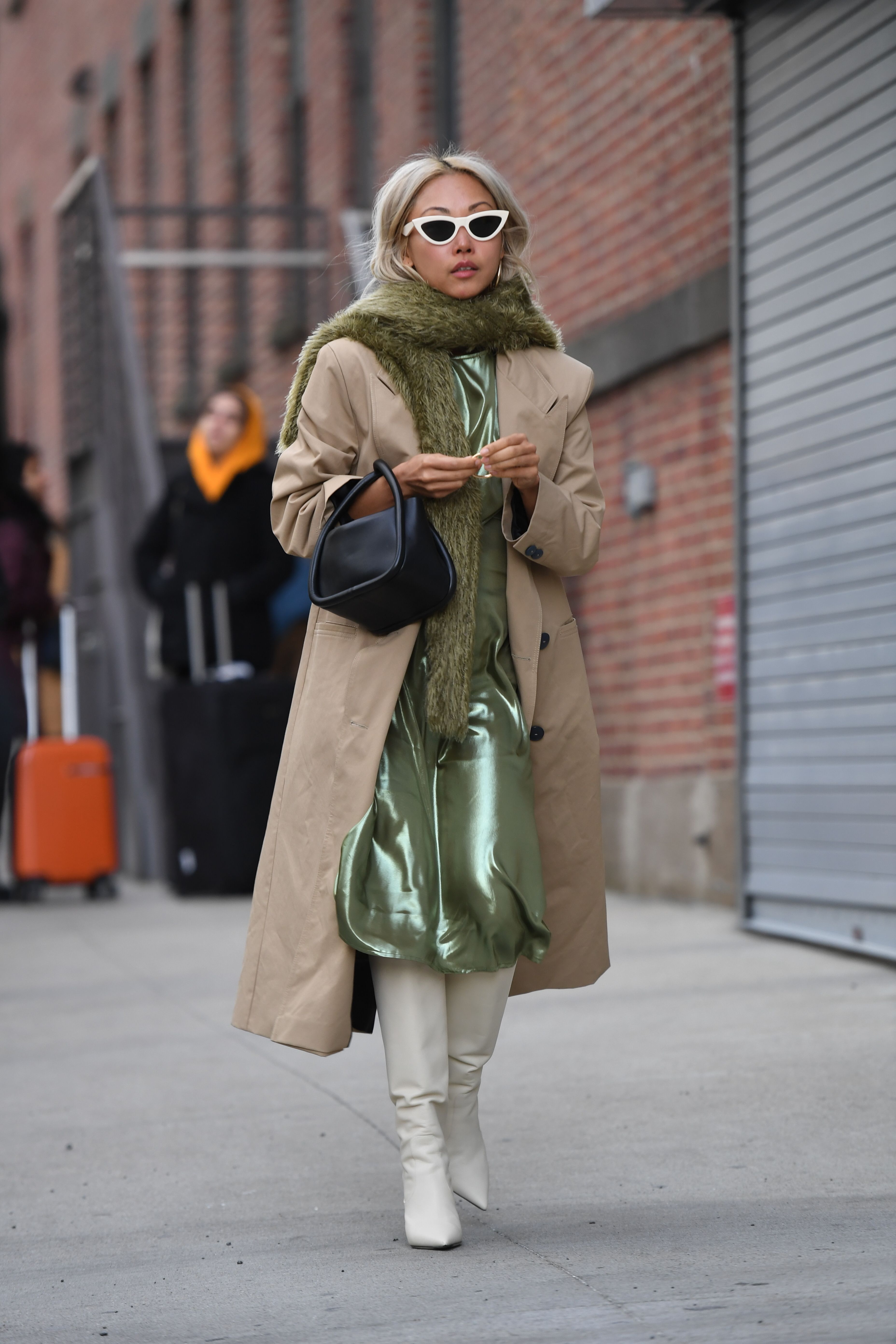 A guest is seen in New York wearing a metallic green dress and white boots during NYFW.