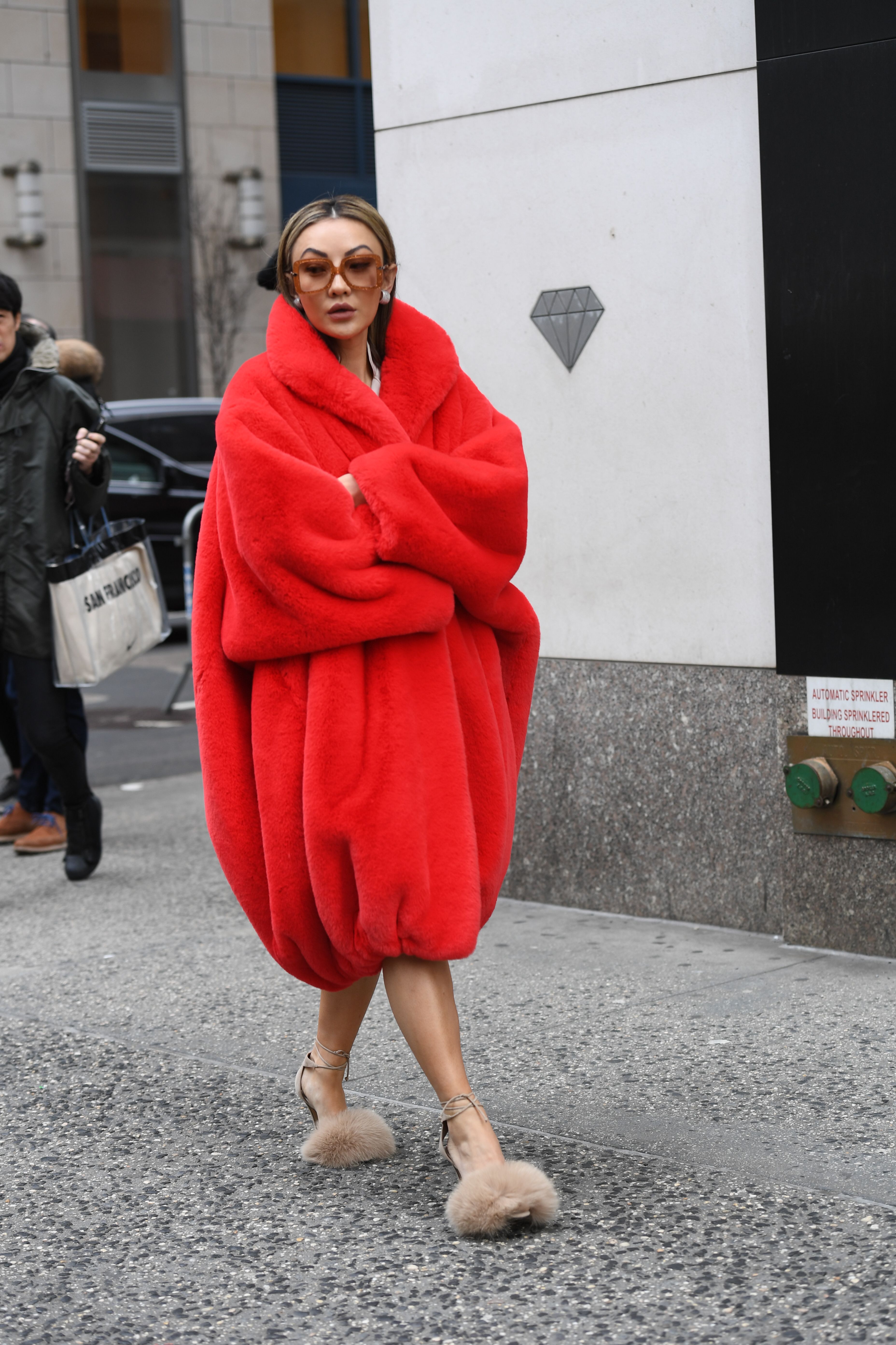 A guest wears a large red fur coat and fur-accented heels during NYFW in New York City.
