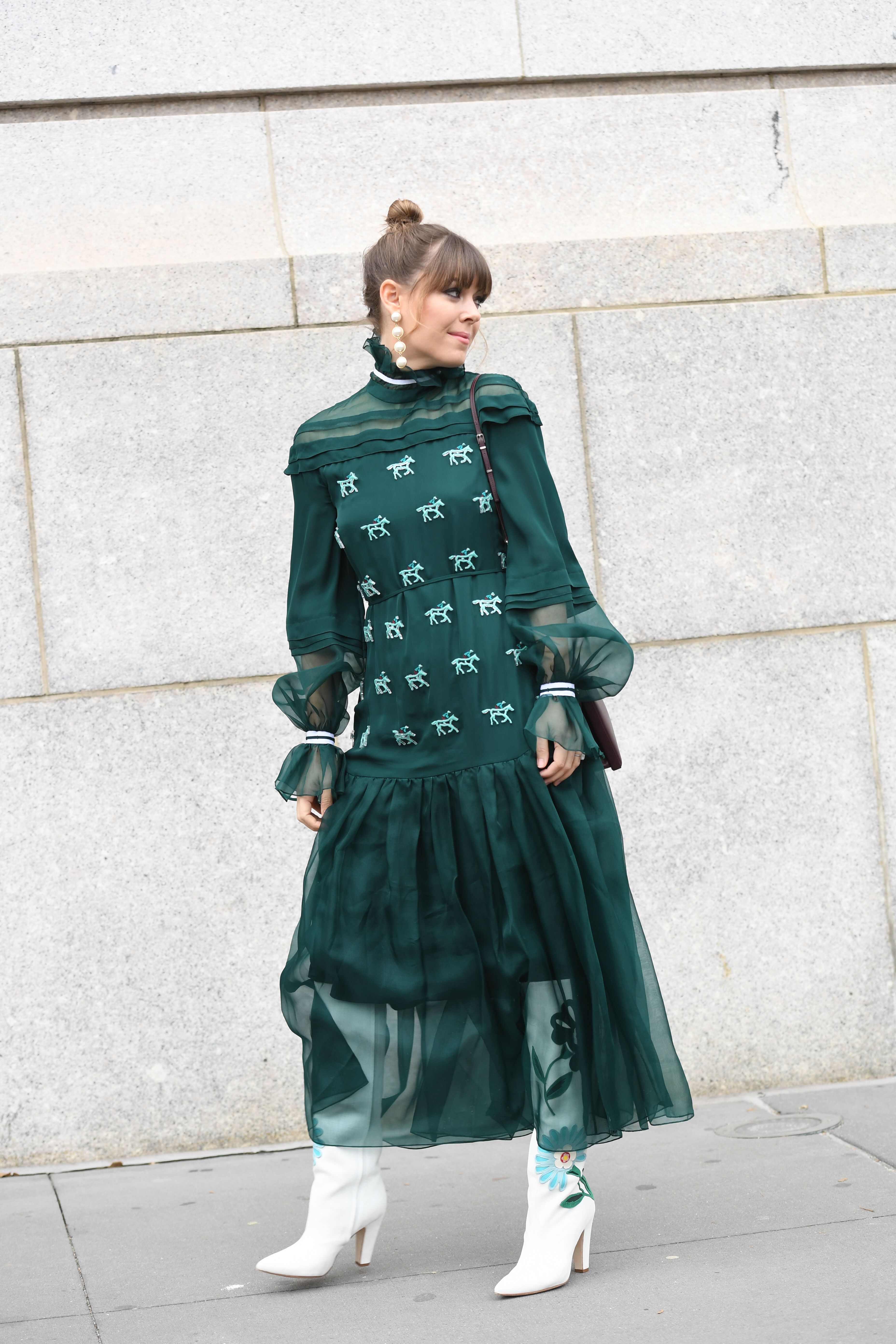 A guest is seen during NYFW 2019 wearing a green dress, white embroidered boots and dangly pearl earrings.