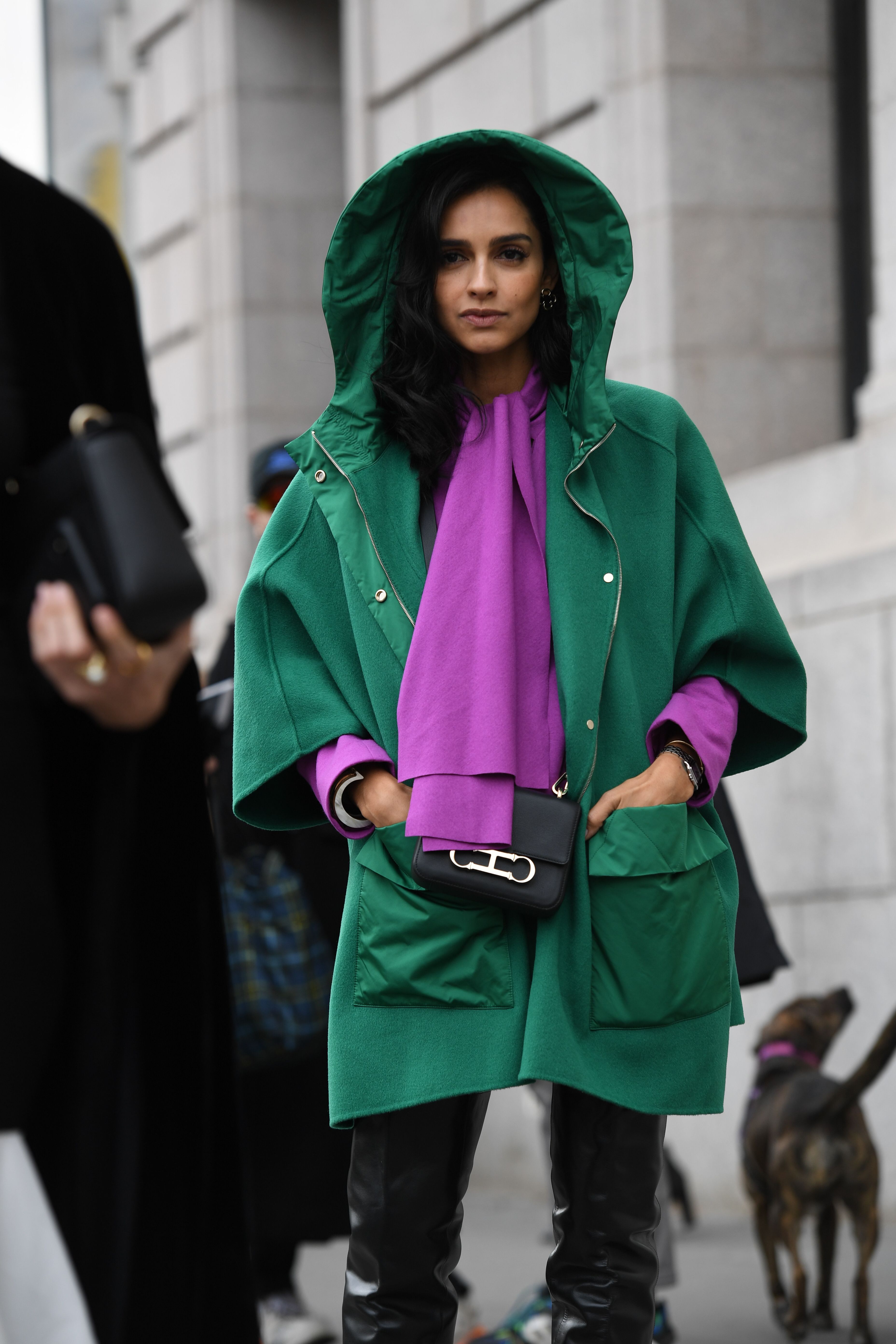 A guest is seen outside NYFW wearing a purple top and green coat.
