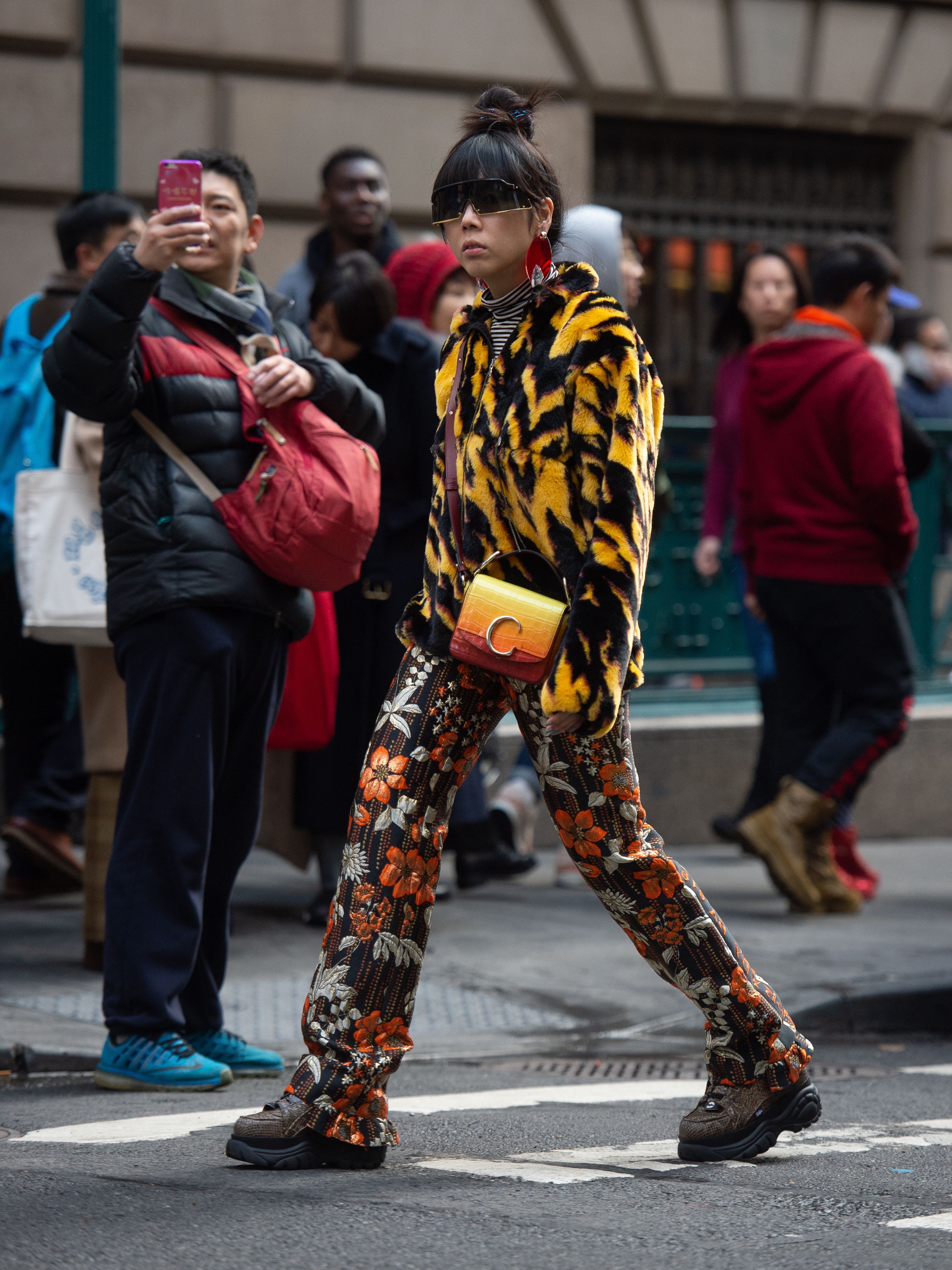 A guest is seen in clashing patterns during NYFW.