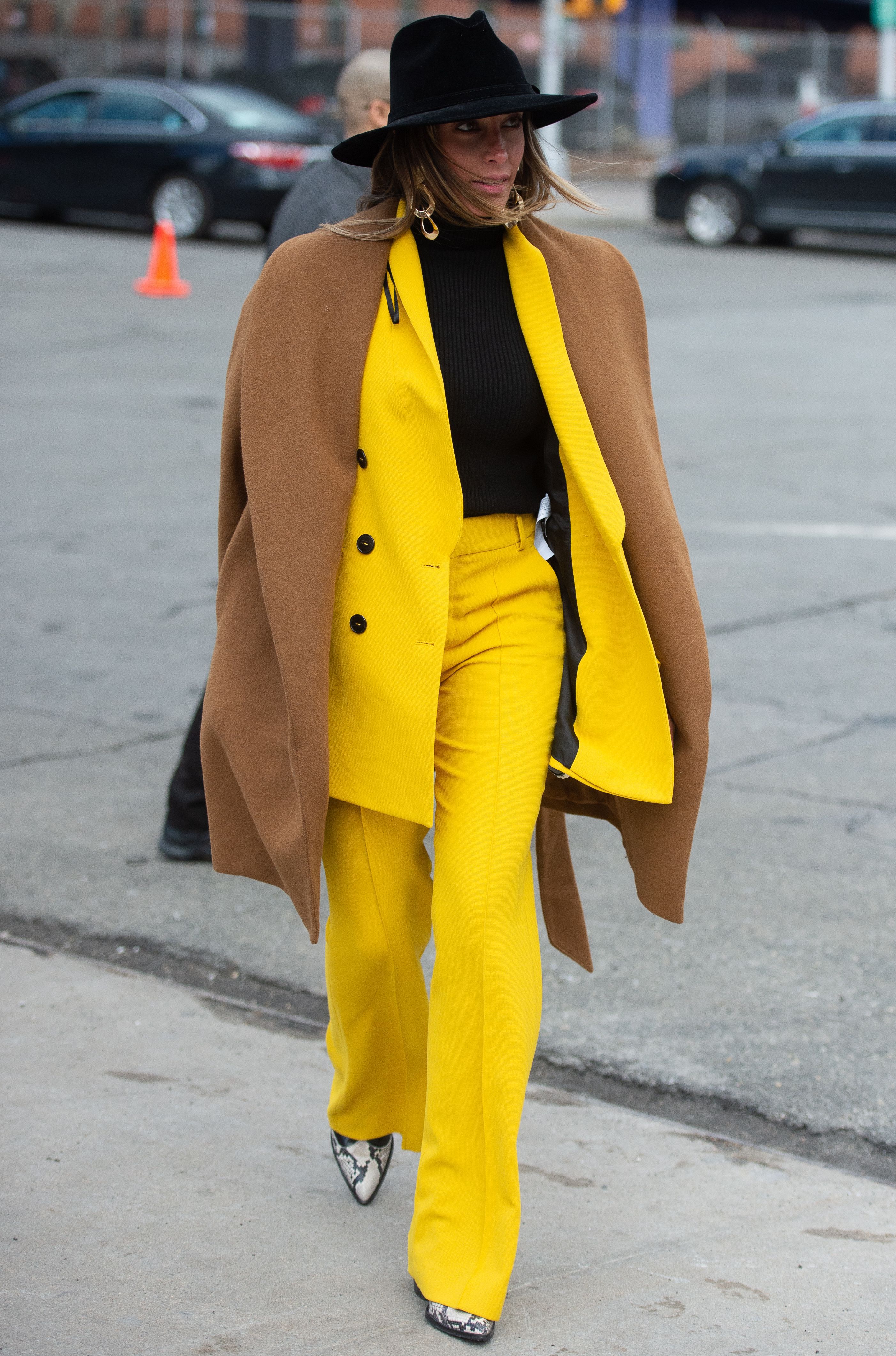 A guest is seen wearing a bright yellow suit and snakeskin boots during NYFW 2019.