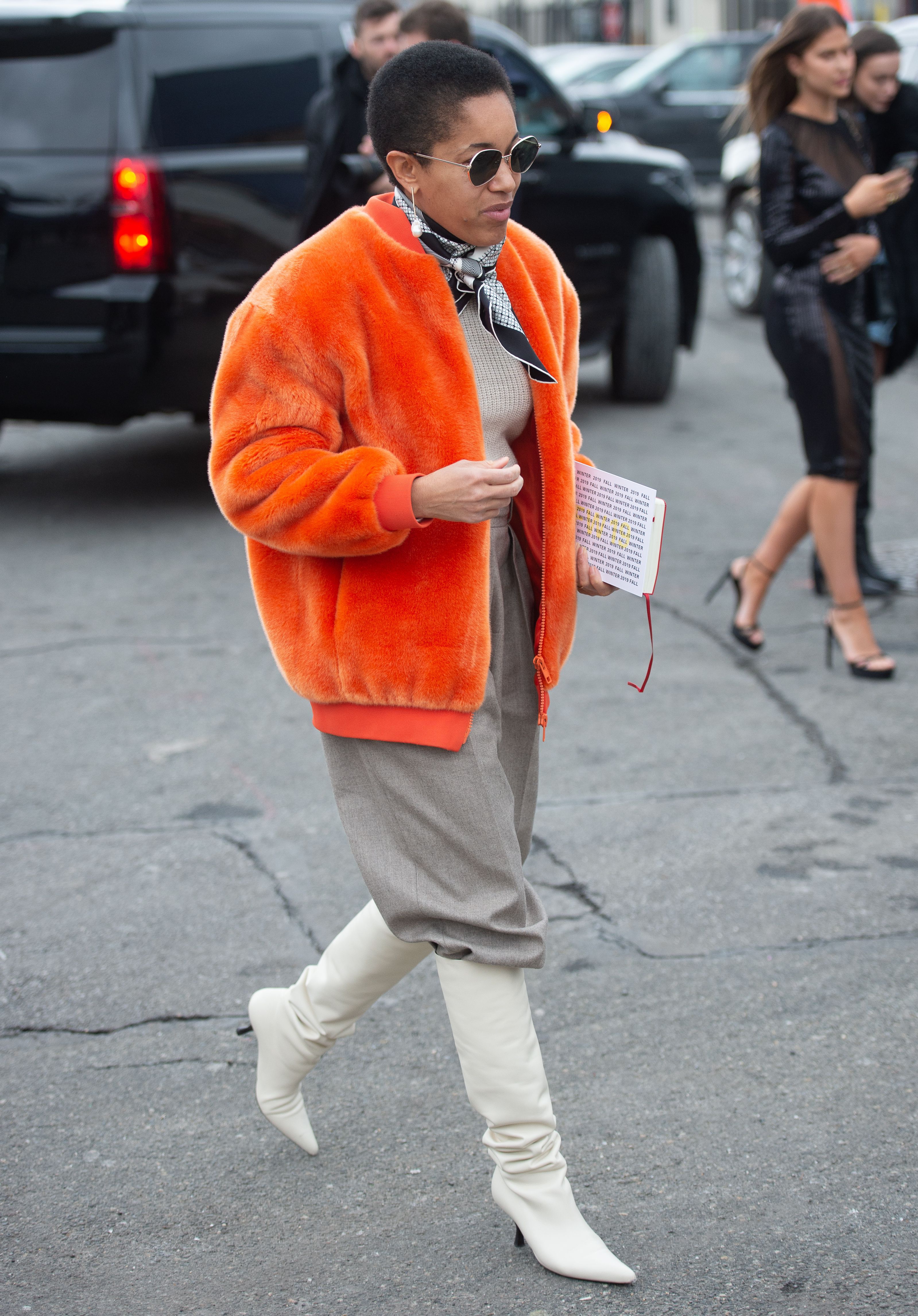 Tamu McPherson is seen during NYFW wearing an orange coat and white boots.