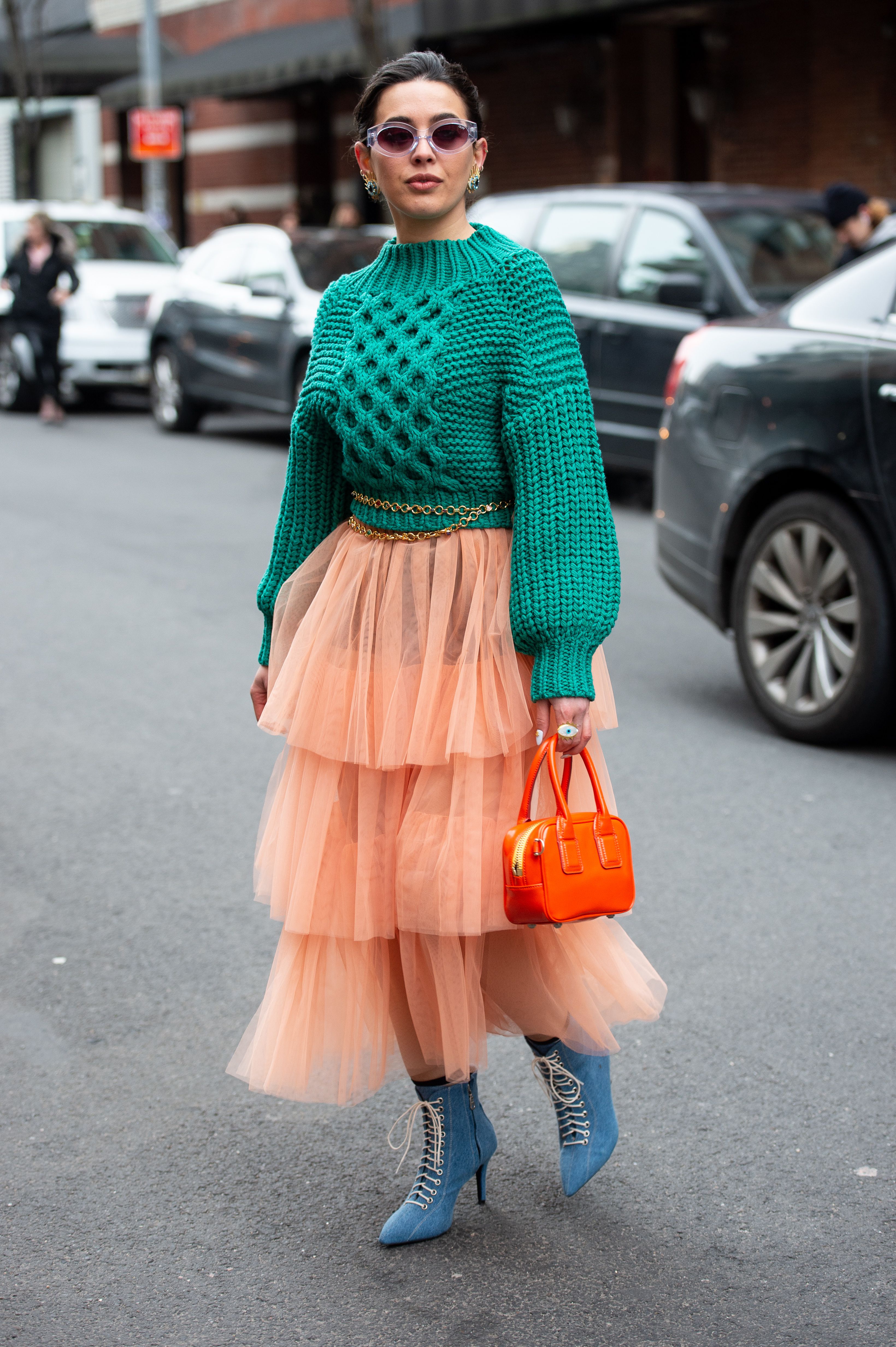 A guest is seen during NYFW wearing a teal sweater, peach tulle skirt and blue lace-up booties.