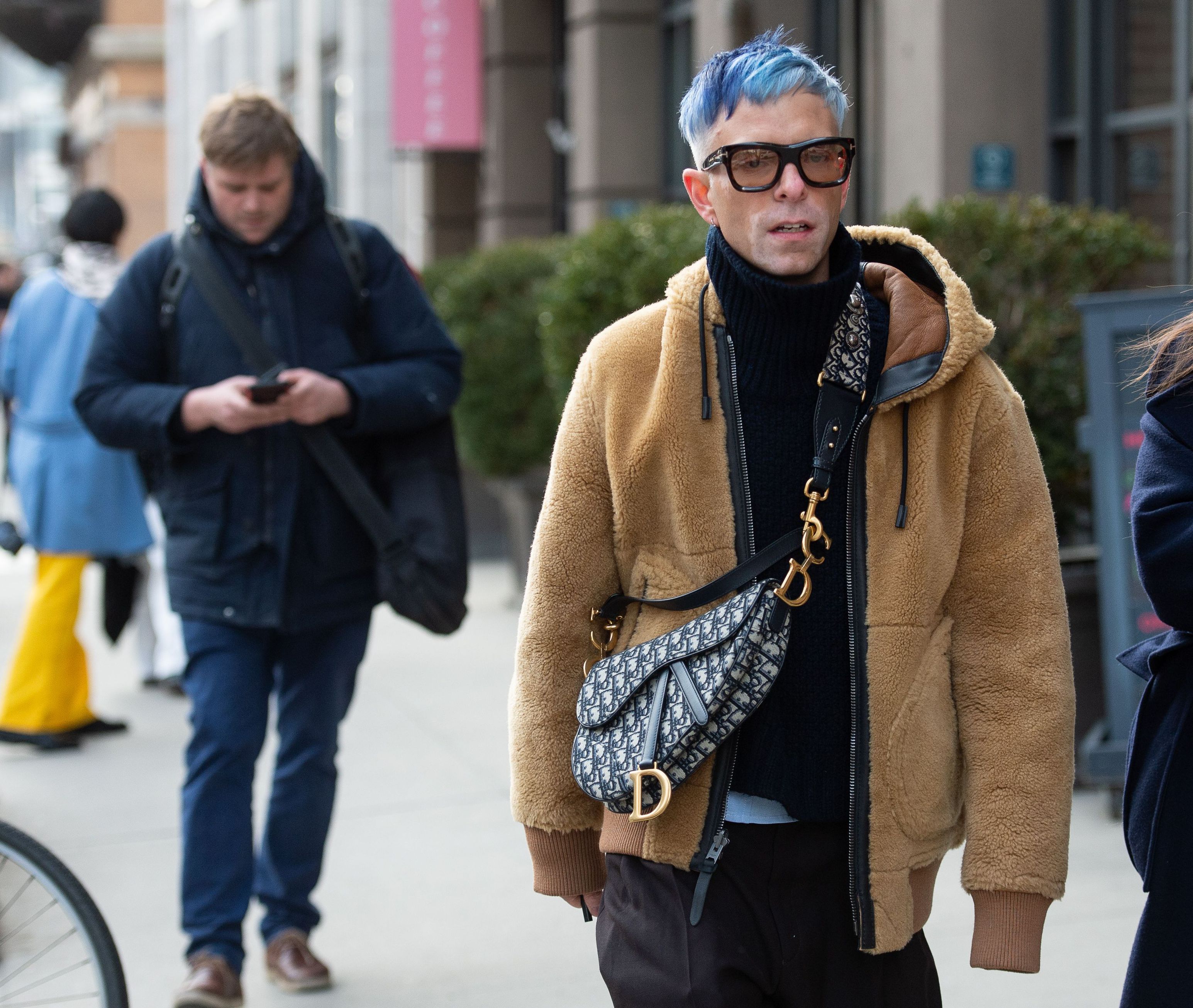 Editor-in-chief of Paper Magazine, Drew Elliott is seen wearing a brown hooded jacket and a Dior bag during NYFW.