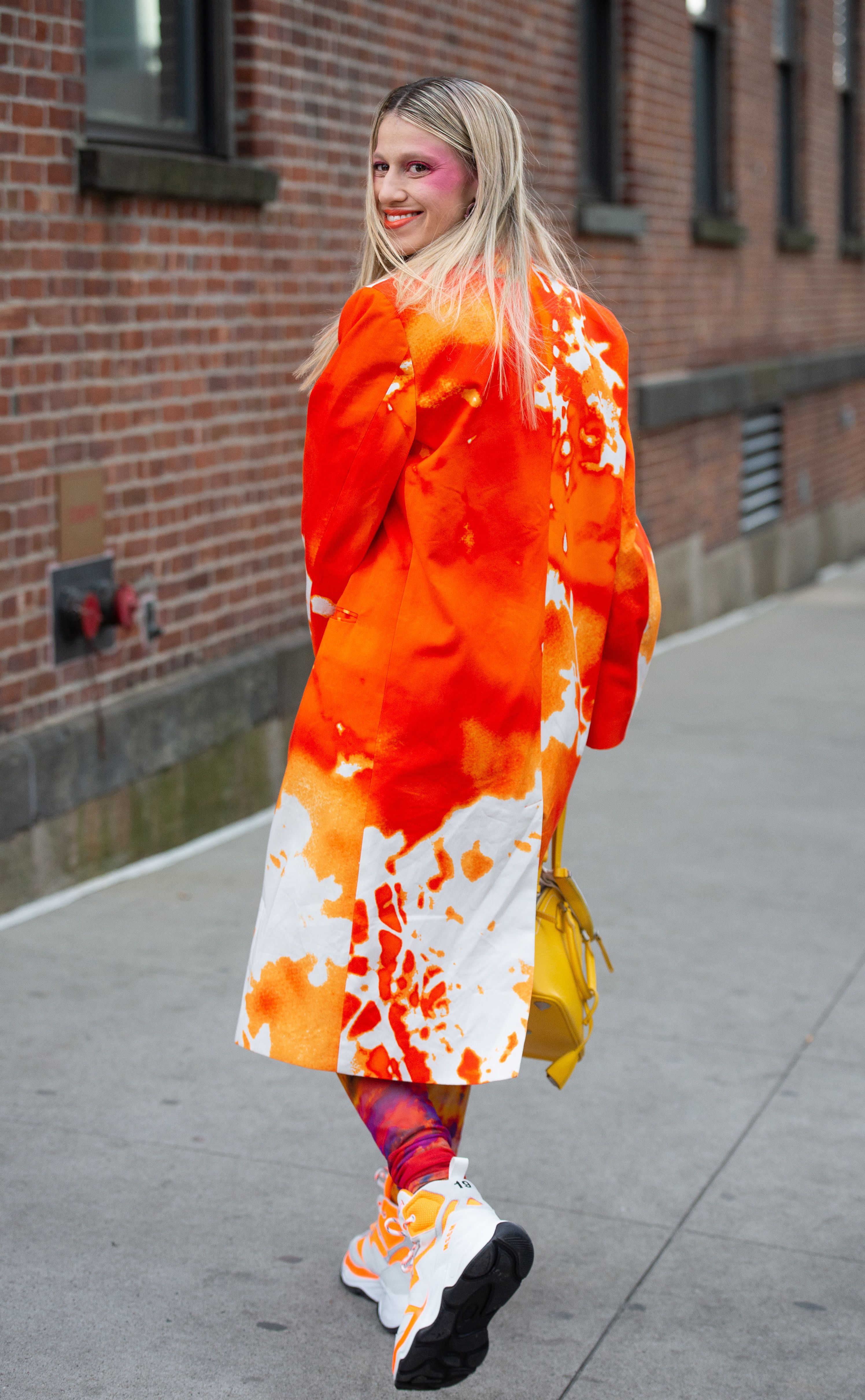 A guest is seen in New York wearing a tie-dye coat and sneakers during NYFW.