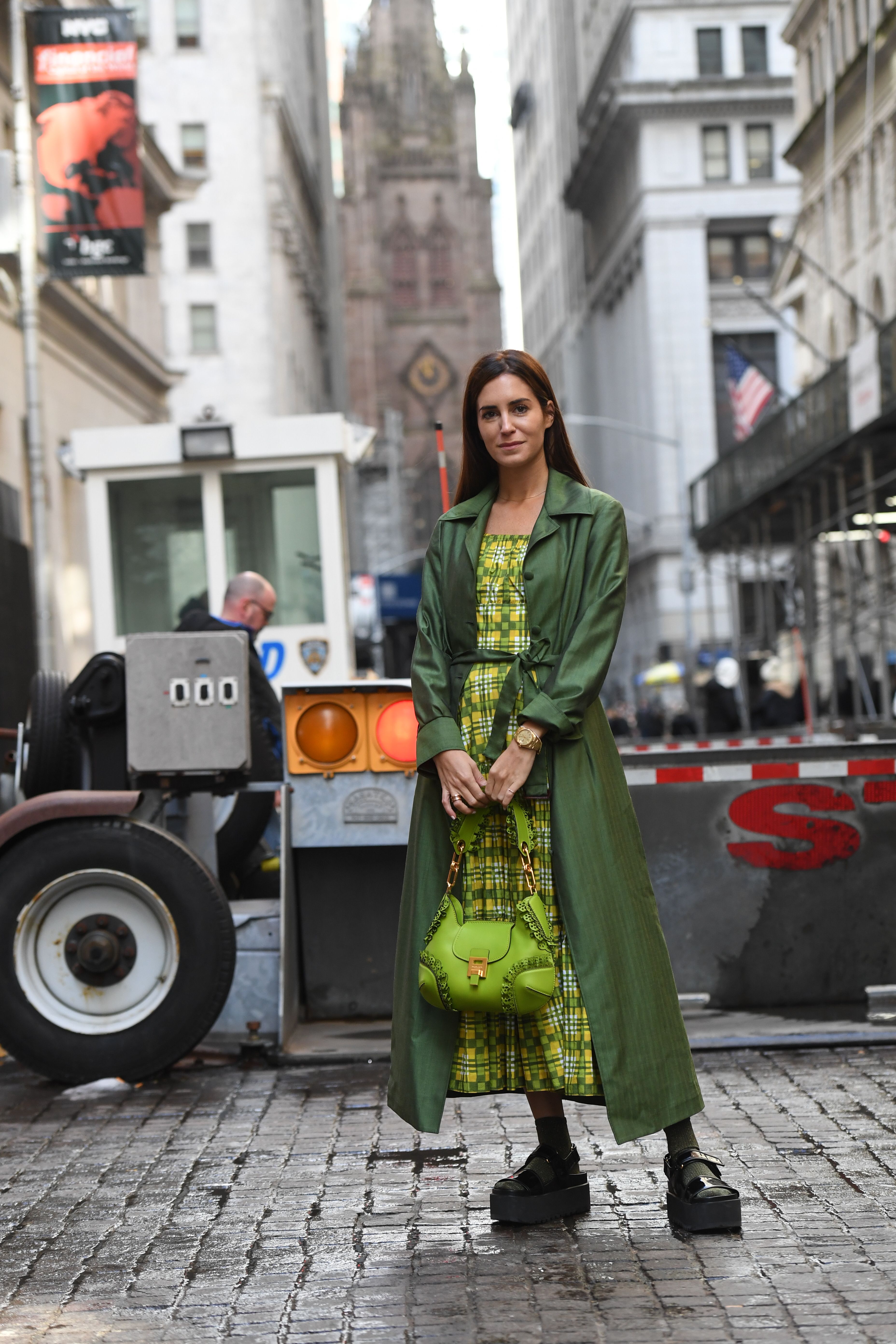 A guest is seen in New York wearing a patterned green dress, green coat, green bag and chunky black sandals.