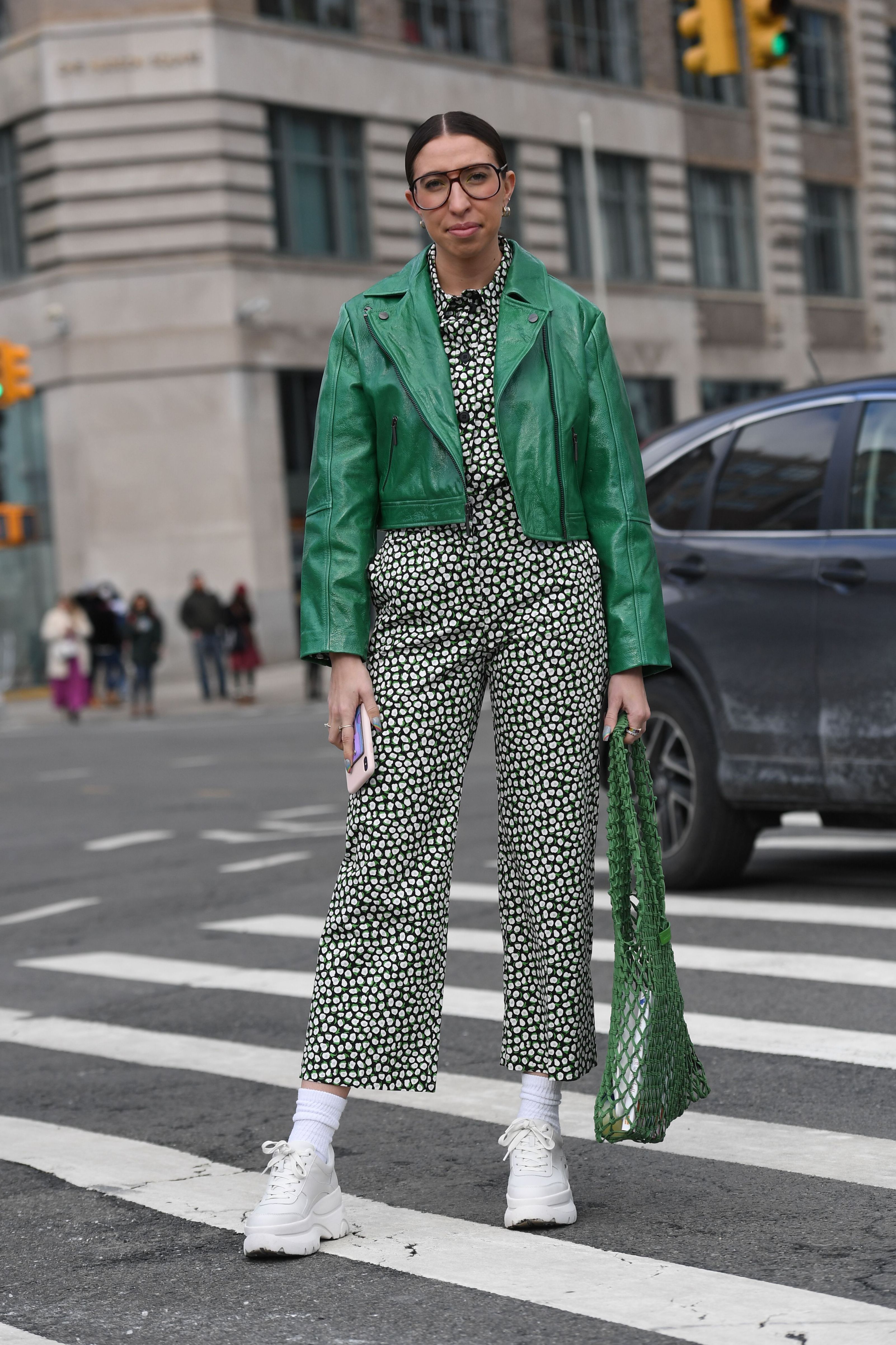 A guest is seen during NYFW wearing a polka dot jumpsuit and a green jacket.