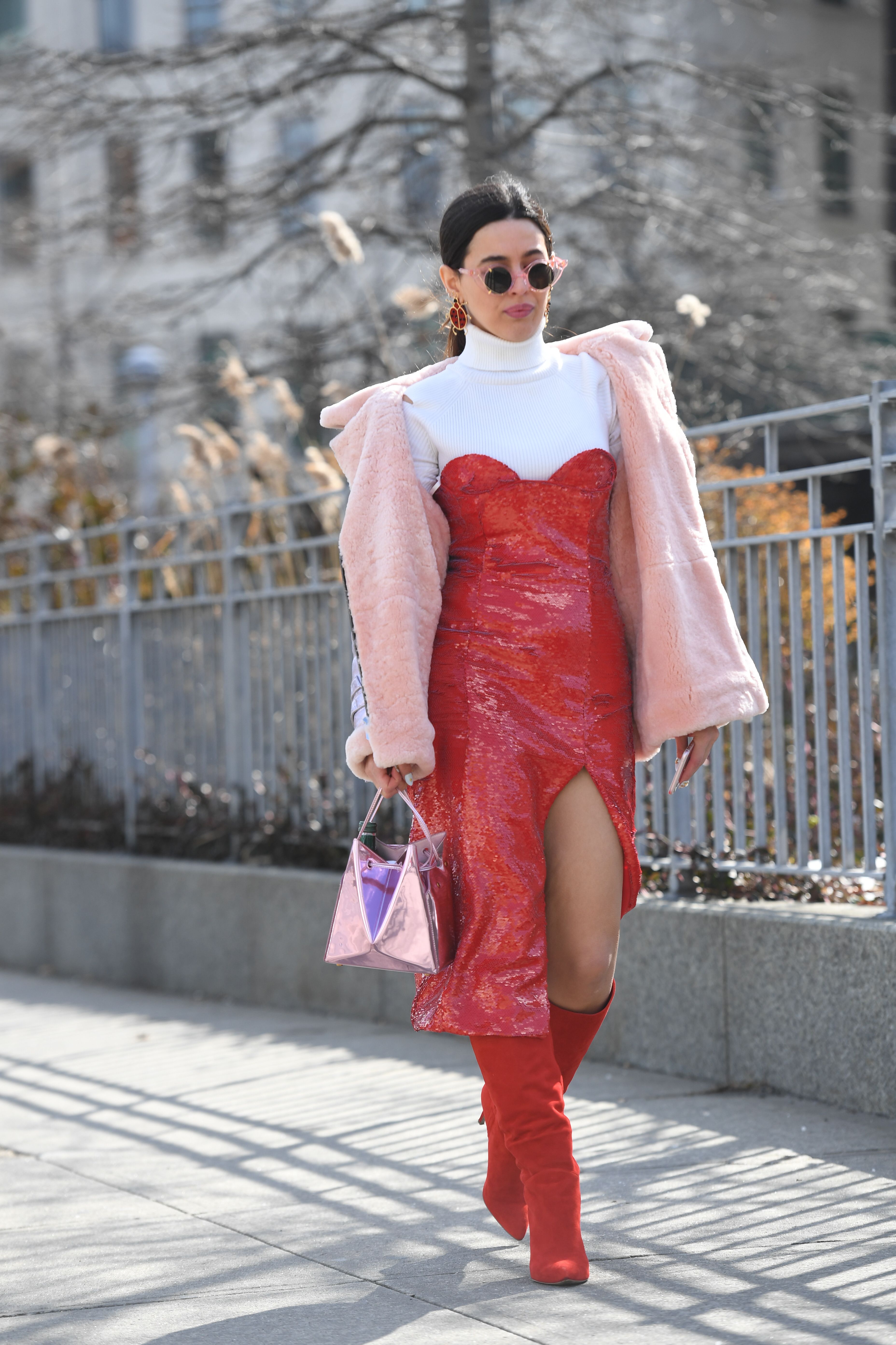 A guest is seen on the streets of New York wearing a red dress, red boots and pink fur coat during NYFW.