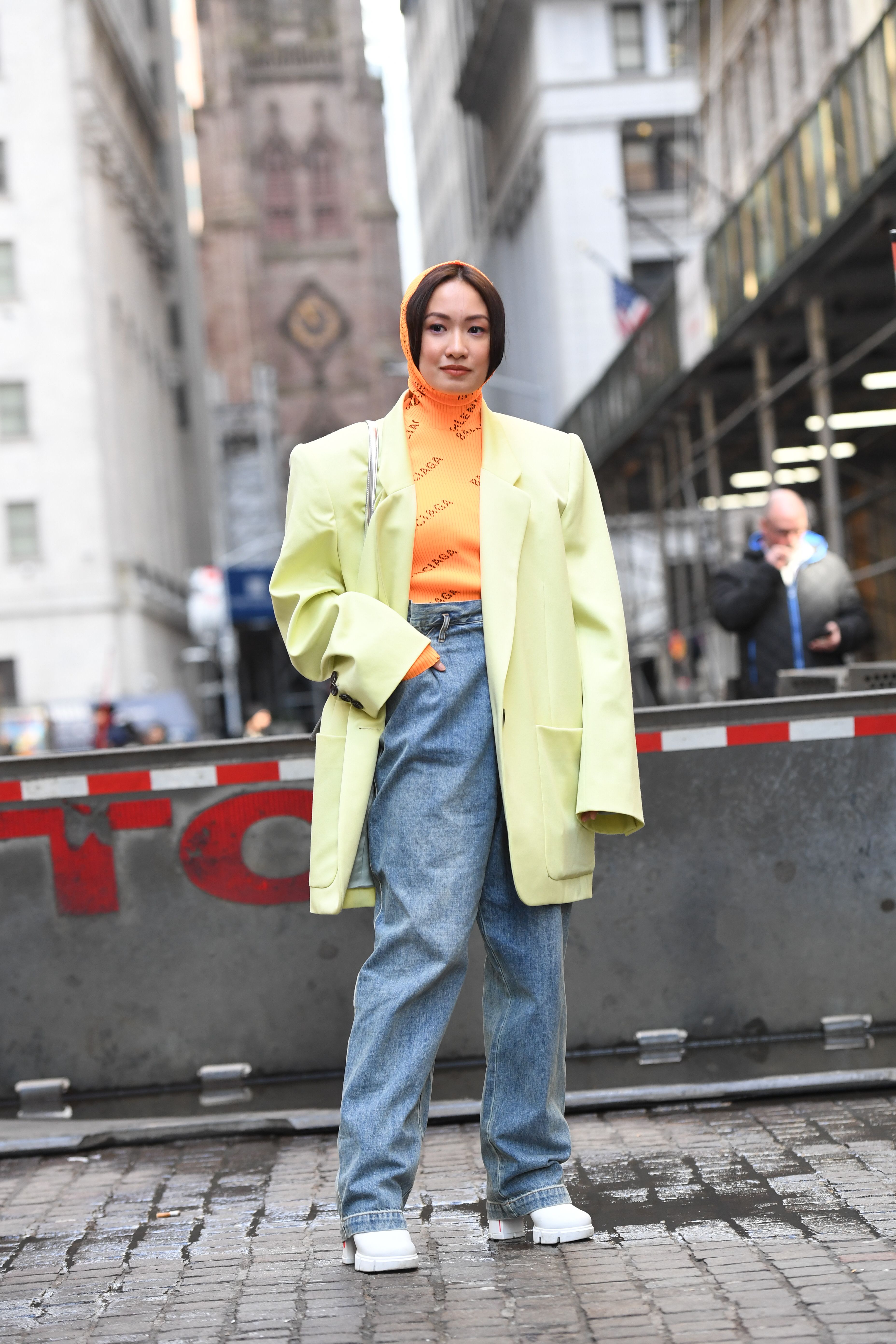 A guest is seen in New York wearing an orange hoodie, oversized green blazer and jeans outside NYFW.