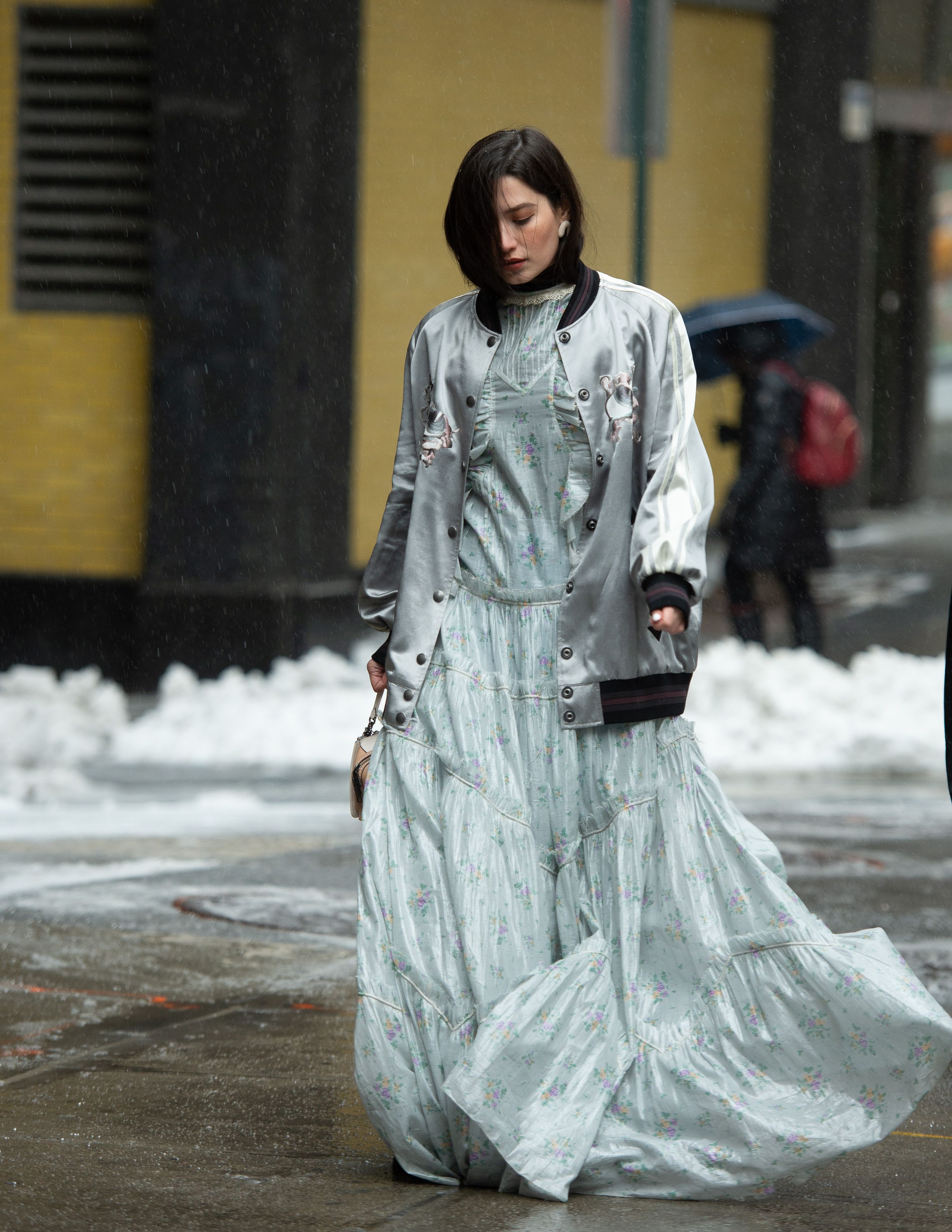 A guest is seen wearing a long light blue floral gown and metallic silver jacket during NYFW.