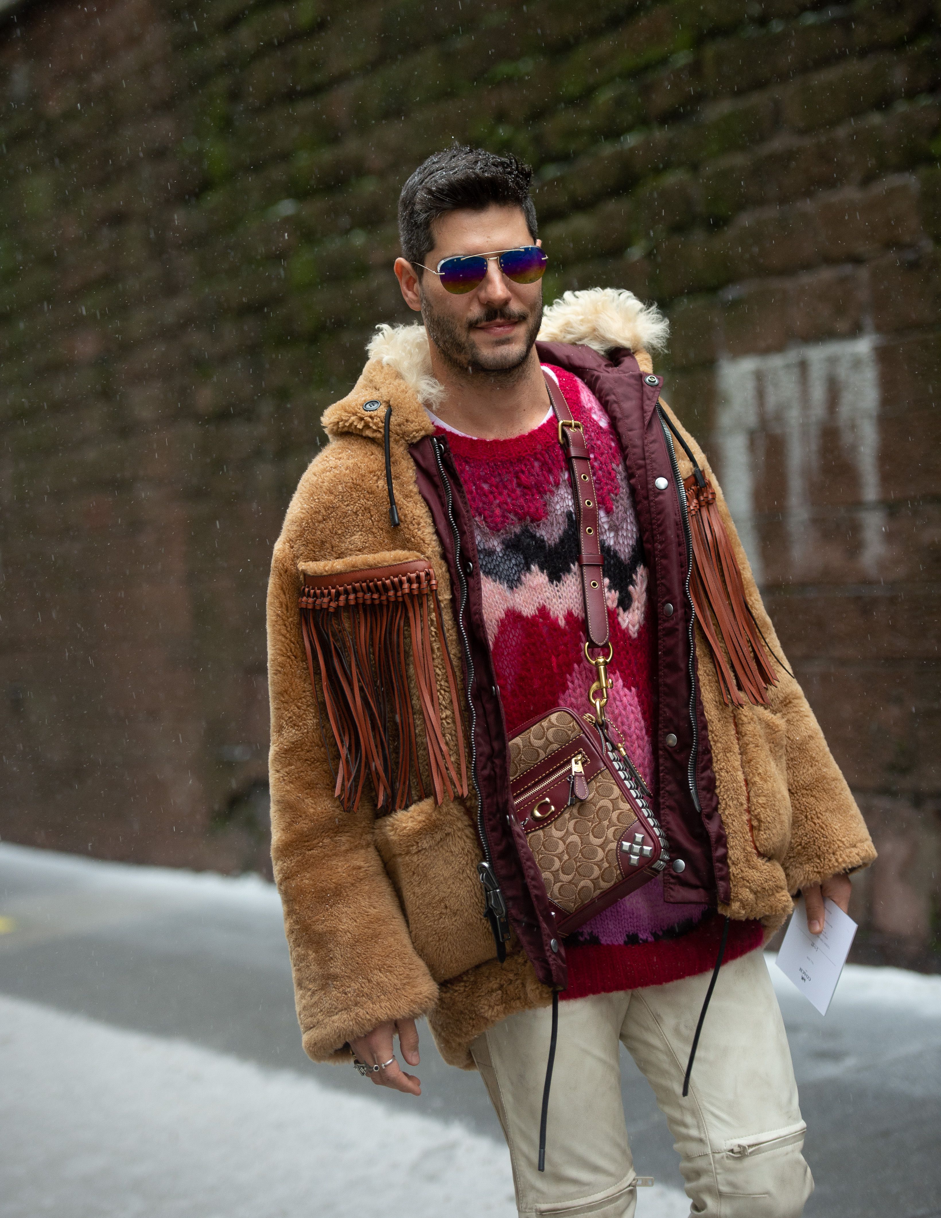 A guest is seen wearing a pink patterned sweater and brown coat, carrying a Coach bag outside NYFW.