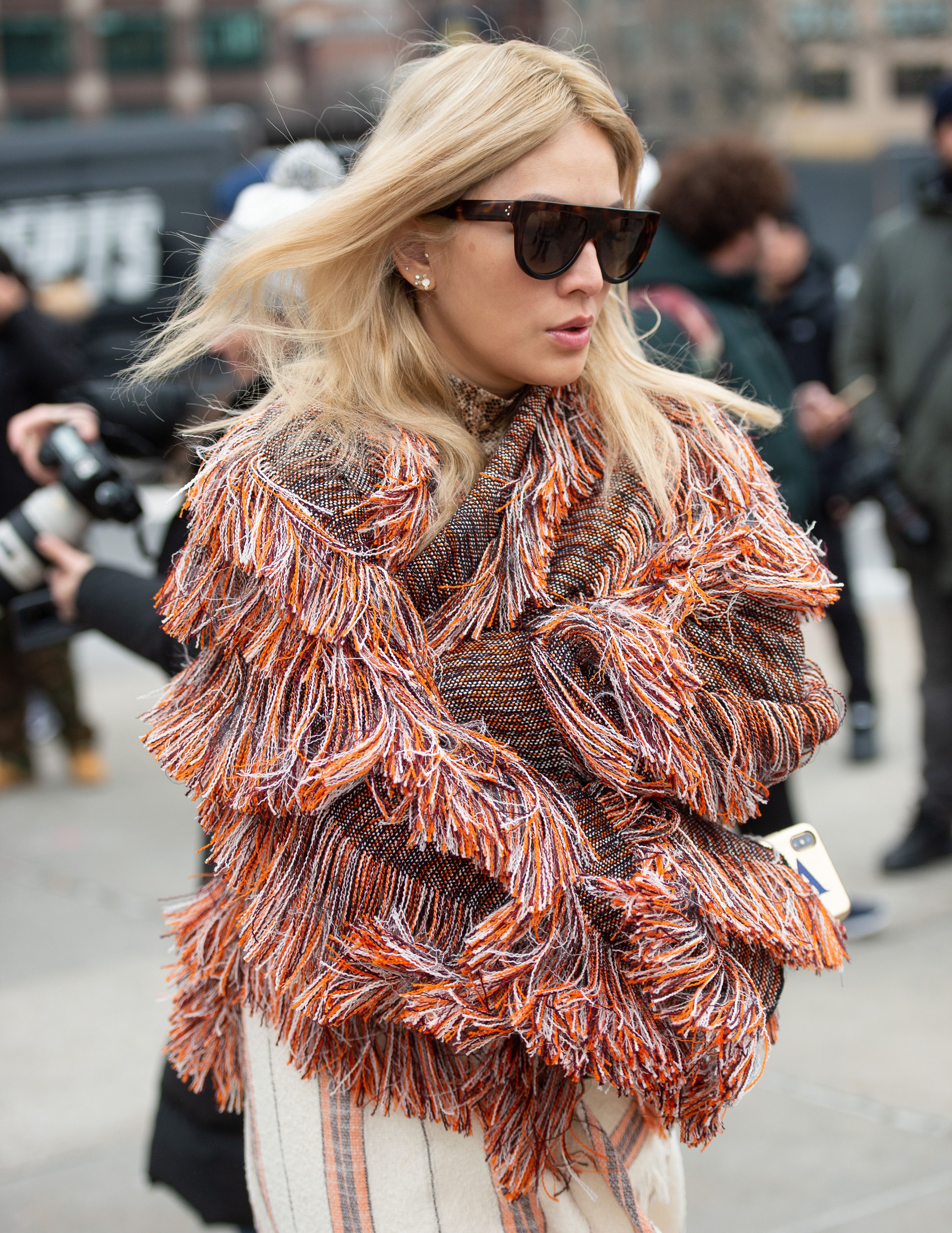 A guest is seen in a colorful fringed poncho outside of NYFW 2019.