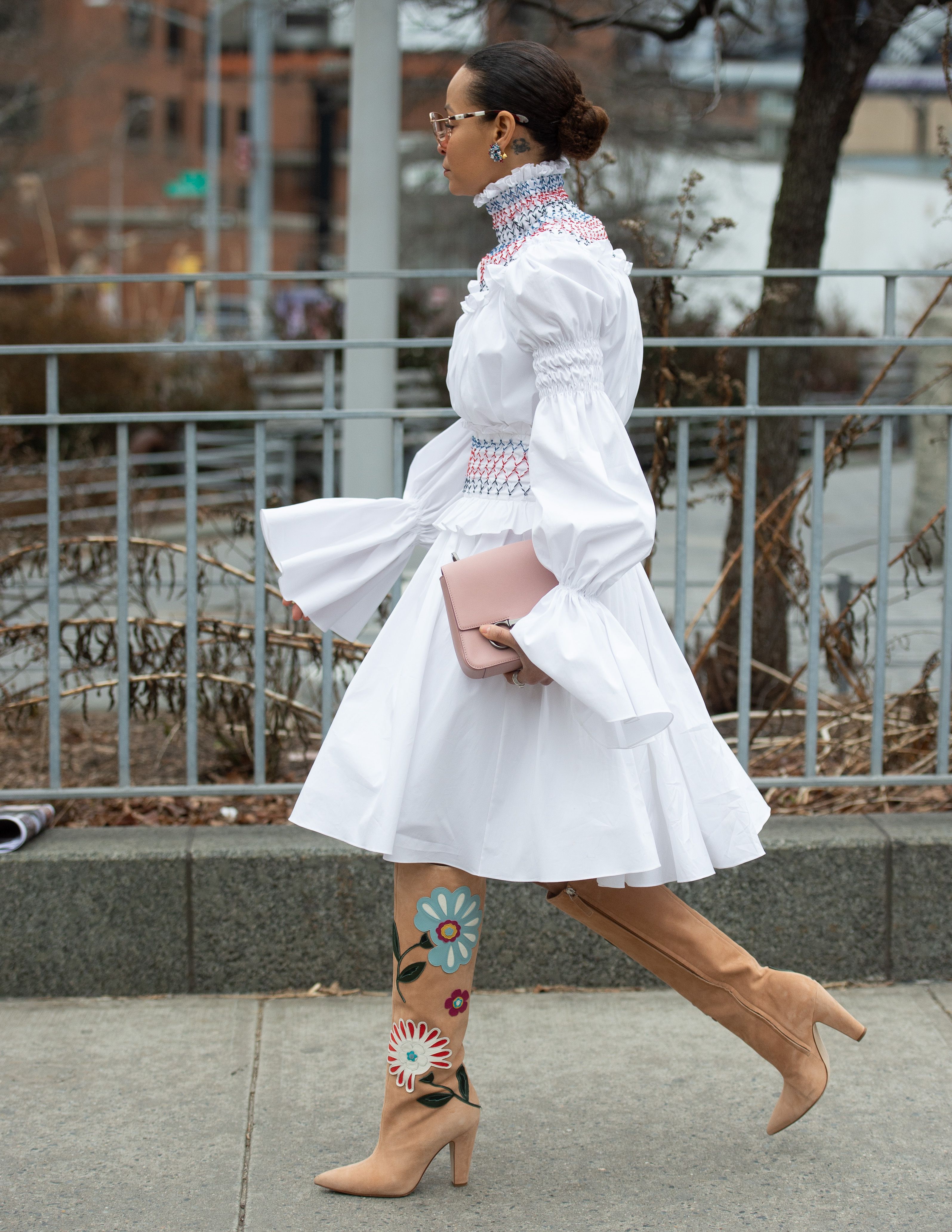 A guest is seen attending NYFW wearing a white dress and embroidered brown boots.