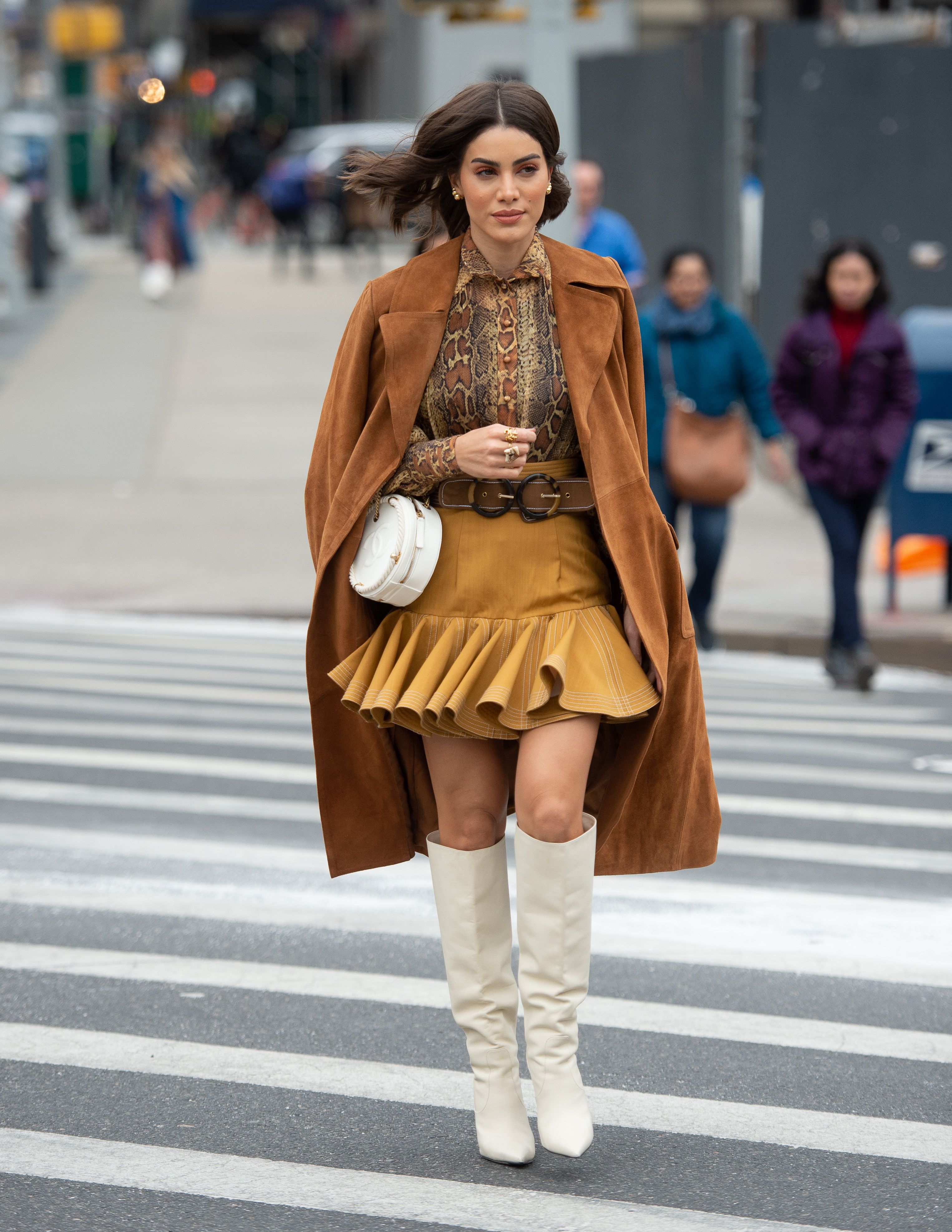 A guest is seen outside NYFW wearing an animal print blouse, brown skirt, brown coat and white boots carrying a white Chanel bag.