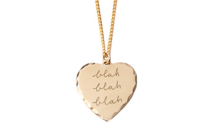 Engraved with cheeky sayings and zeitgeisty references like Beyoncé‘s “I woke up like this” or Taylor‘s “Haters gonna hate,” these $40 heart-shaped pendants come in brass (though you can get them custom-made in gold or silver) on your choice of an 18- or a 24-inch plated chain.
