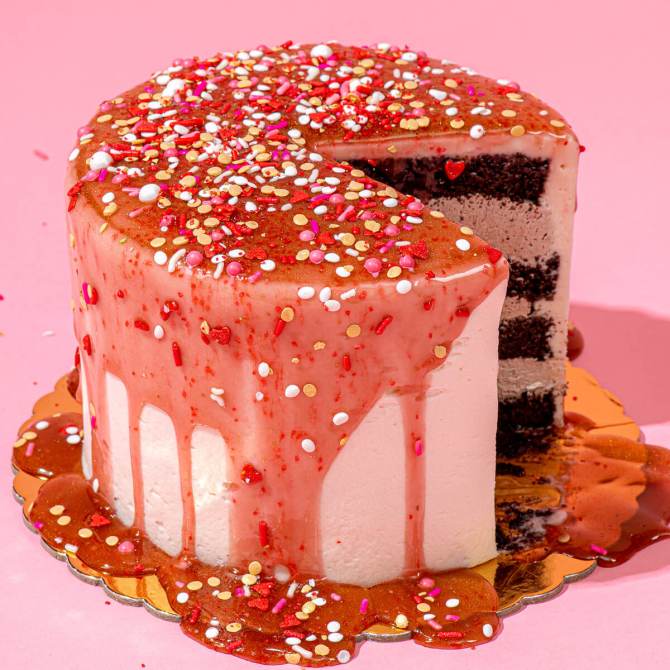 If you’re realllllly not able to channel your inner baker, I’ve got the solution for you—scroll through the below and appreciate how cute and festive our ideas are, then play it safe and order yourself a cake from celeb pastry chef Zac Young of Piecaken Bakeshop instead. I won’t judge you! The Spill Your Heart Out Cake is $99 on Goldbelly and it comes with a rosé champagne glaze you add yourself just before you serve. So it’s almost like you made it, right???