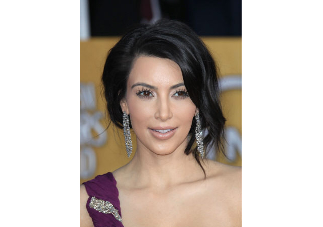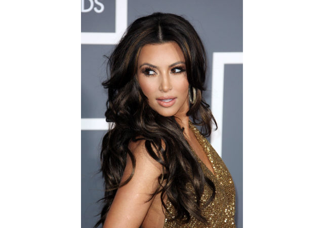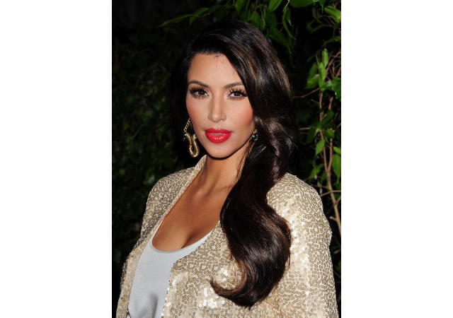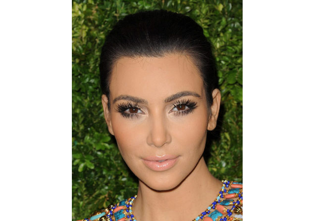 At her 30th birthday, Kim wears her hair down and sports va-va-voom lashes with black eye liner and metallic shadow lightening up the inner corners of her eyes. She keeps the rest of the makeup neutral, with nude lips and a light rosy blush.