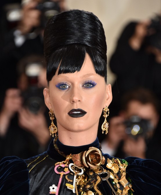 <b>Katy Perry</b> did not hold back on the hair and makeup, to say the <i>very</i> least. Her black lipstick and major blue lashes both came courtesy of her new COVERGIRL offerings, but hairstylist <b>Chris Appleton</b> created that major beehive with several products from Oscar Blandi, including what Appleton referred to as “a ton” of <a href=”http://www.ulta.com/brand/oscar-blandi”>Lacca Medium Hold Hair Spray</a>.