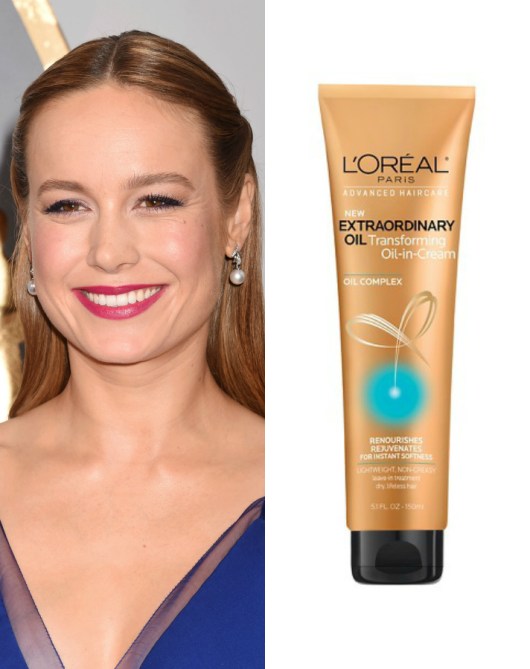 Get <b>Brie Larson</b>’s sleek, polished hair with <a href=“http://www.lorealparisusa.com/en/products/hair-care/products/hair-treatments/advanced-haircare-extraordinary-oil-transforming-oil-in-cream.aspx”>L’Oreal Paris Advanced Haircare Extraordinary Oil Transforming Oil-in-Cream</a> ($6.99), which celebrity stylist <b>Mara Roszak</b> used to add plenty of shine.
