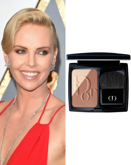 <b>Charlize Theron</b>’s skin was downright luminous—no easy feat! Makeup artist <b>Francesca Tolot</b> started off with <a href=“http://www.dior.com/beauty/en_us/fragrance-beauty/makeup/face/foundation/pr-foundation-y0770800-perfectmakeupeverlastingwearpore-refiningeffectspf35-pa+++%252Fshinecontrol.html”>Dior Diorskin Forever Foundation in #030 Medium Beige</a> ($50) to smooth everything out, then swept the brand-new <a href=“http://www.dior.com/beauty/en_us/fragrance-beauty/makeup/face/blush/pr-blush-y0716250-professionalcontouringpowderblush.html”>Dior Diorblush Sculpt in 003 Beige Contour</a> ($43) all over for some natural color.