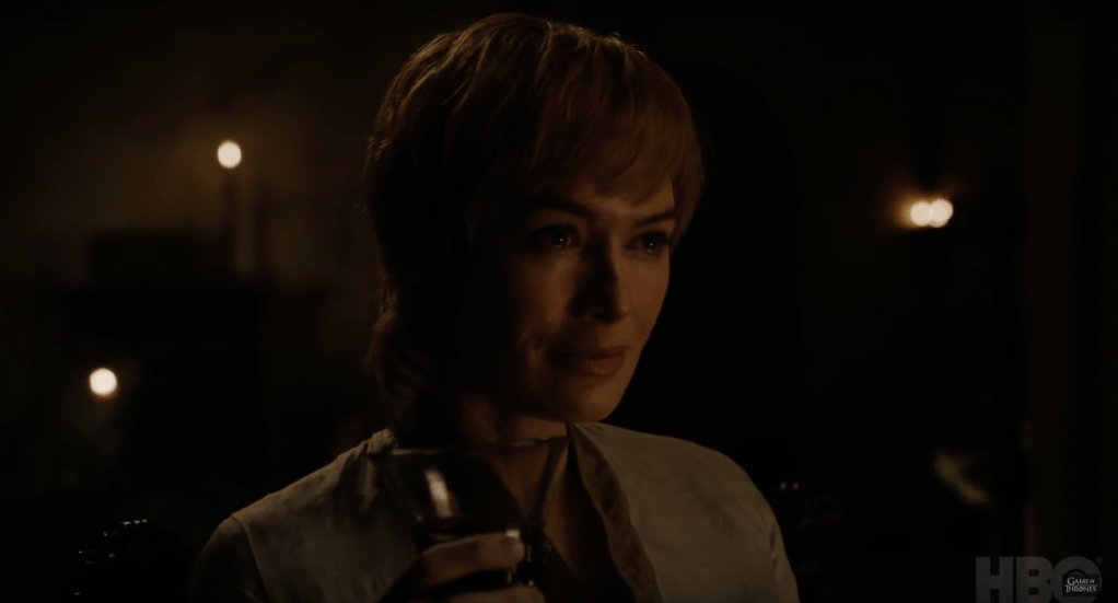 There’s a steamy make-out shot between the Unsullied leader Grey Worm and Missandel, Khalessi’s trusted advisor and handmaiden. Jamie Lannister is spotted swinging his sword in a huge battle, surrounded by fire. (Fire from the dragons, perhaps? We shall see.) That’s followed by a close-up of Cersei—holding a glass of red wine, as usual—sporting her classic poker face but with a few tears in her eyes.