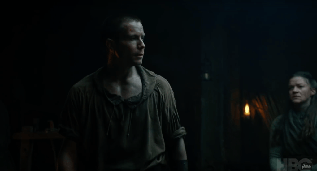 We then see quick cuts of some of our favorite heroes. With the death of Tommen, House Baratheon is thought to be completely extinct. But we’re given a little glimpse of Gendry (the unacknowledged bastard of Robert Baratheon). Could he be gunning for the throne too? It wouldn’t necessarily fit his personality to fight for the throne for himself—we’re pretty sure he’ll be on the good guy’s side, though.