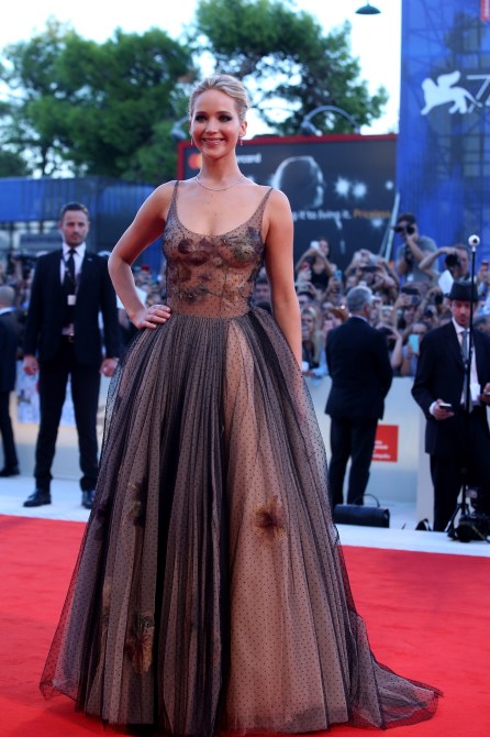 The dress isn’t the only sheer ensemble Lawrence has sported recently. A day earlier, on Tuesday, Lawrence showed up at the Venice Film Festival in a see-through—wait for it—ball gown while walking the red carpet. The Dior dress, which included airy polka-dot tulle, was 100-percent sheer in the bodice, with embroidered flowers strategically placed over Lawrence’s nipples.
