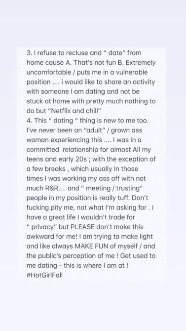 4. This “dating” thing is new to me too. I’ve never been an “adult” / grown ass woman experiencing this …. I was in a committed relationship for almost All my teens and early 20s ; with the exception of a few breaks, which usually In those times I was working my ass off with not much R&R….and “meeting/trusting” people in my position is really tuff. Don’t f*cking pity me, that’s not what I’m asking for. I have a great life I wouldn’t trade for “privacy” but PLEASE don’t make this awkward for me! I am trying to make light and like always MAKE FUN of myself / and the public’s perception of me! Get used to me dating – this is where I’m at! #HotGirlFall.”