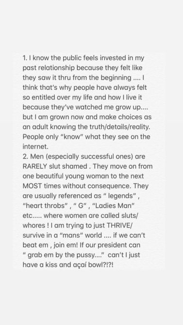 2. Men (especially successful ones) are RARELY slut shamed,” she said. “They move on from one beautiful young woman to the next MOST times without consequence. They are usually referred to as “legends”, “heart throbs”, “G”, “Ladies Man”, etc…. where women are called sluts/whores! I am trying to just THRIVE/survive in a “mans” world…If we can’t beat em, join em! If our president can “grab em by the pussy….” can’t I just have a kiss and an açai bowl?!?!
