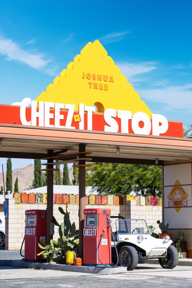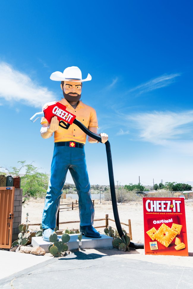 Smack-dab in the middle of the California desert there’s the unimaginable: an enormous, towering cowboy statue wielding a gas nozzle with Cheez-It branding next to a life-size box of the beloved crunchy snack. Nope, it’s not a fever dream caused by sweltering heat. Cheez-It legit transformed what appears to have been a decades-old gas station into a one-week-only Cheez-It Stop, aka an IG- and TikTok-worthy road trip destination perfect for anyone obsessed with snacks, or a killer photo-op. Allow me to explain.