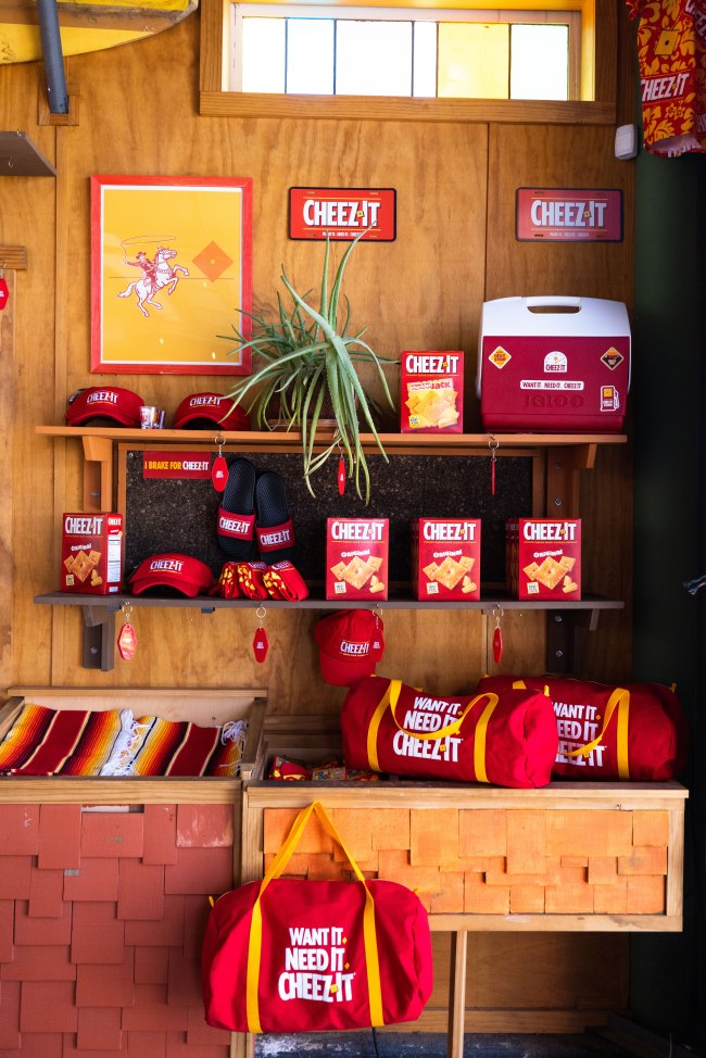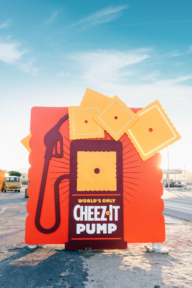 Though you can’t literally drive up to the roadside pumps, free parking is available in the back of the activation. Stroll past decked-out, desert-themed Cheez-It logos to find a myriad of experiences, such as a photo booth inside a vintage, ‘70s-style road trip wagon, other-worldly-looking vehicles you can actually pose with, a patio tacked with bumper stickers that read, “I Break For Cheez-It,” and the pièce de résistance: an actual Cheez-It “gas station” pump that administers yummy mini bags of the snack right into your hands.