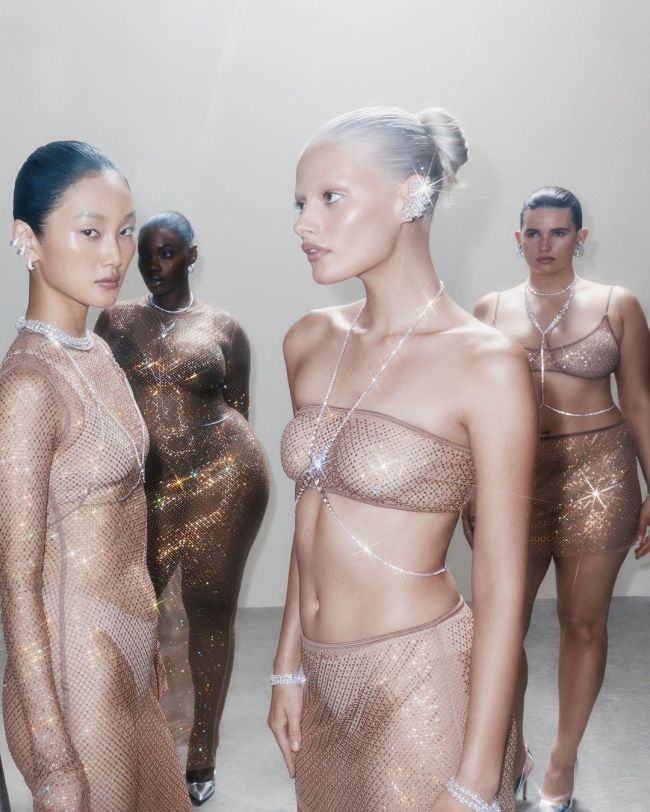 The high glamour high flash vibe of the SKIMS x Swarovski campaign reminds me a lot of the vibe of American Apparel shoots with an Instagram glitter filter over it.