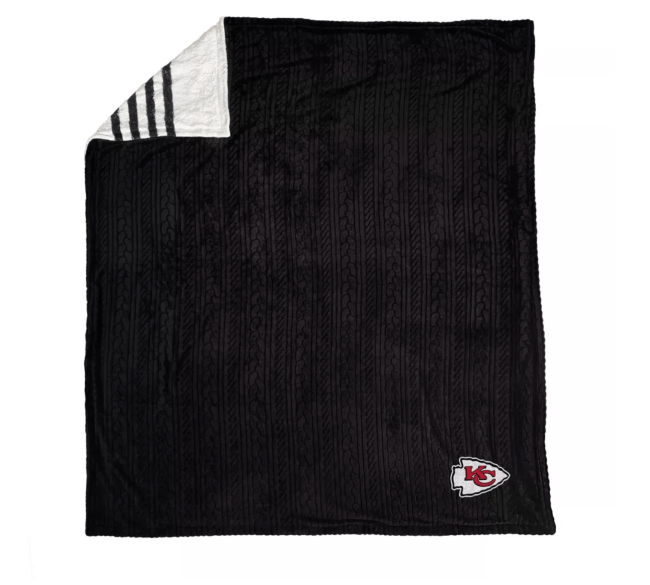 If you’re tired of red (which we hope you aren’t), then maybe this sleek NFL Kansas City Chiefs Embossed Logo Sherpa Stripe Blanket in black is a perfect decor and blanket for you.