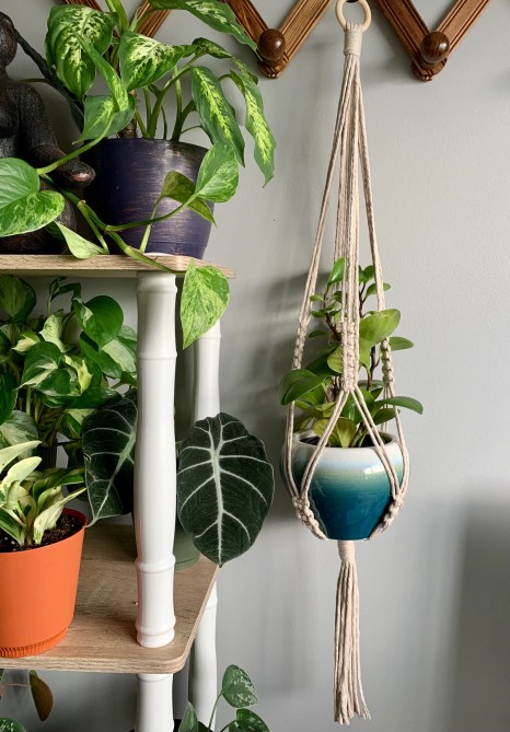 You can also give a fun gift such as a candle with a more functional item like a rechargeable lighter or candle warmer lamp . Or, opt for a space-saving decor moment and give a potted plant with a macrame plant holder. You can also put a gift basket together and give them something useful like a coffee mug and French press with a bag of coffee and a coffee scoop