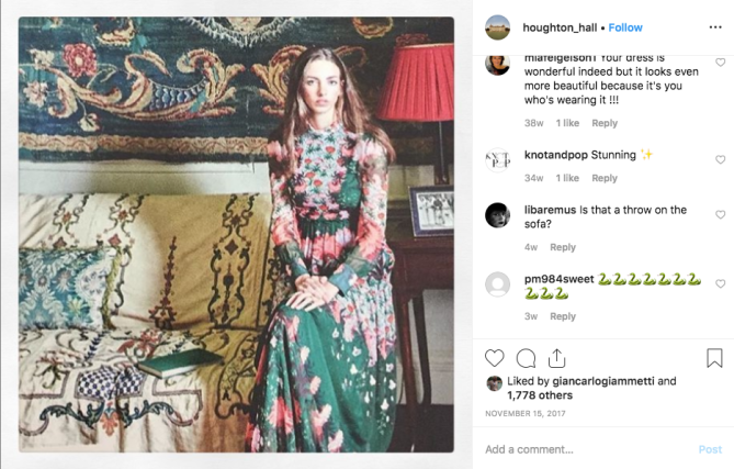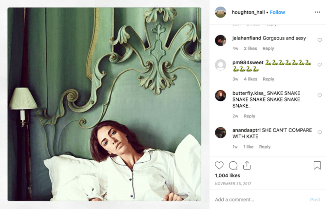 But now they’re taking it a step further, mercilessly unleashing their ire on old photos from Houghton Hall’s Instagram feed that focus on Hanbury. In response to a photo from November 2017 showing Hanbury lounging on an ornate bed, commenters left strings of snake emoji, along with acerbic remarks like, “She can’t compare with Kate.” A portrait of Hanbury seated on the arm of a sofa garnered even more snake emoji.